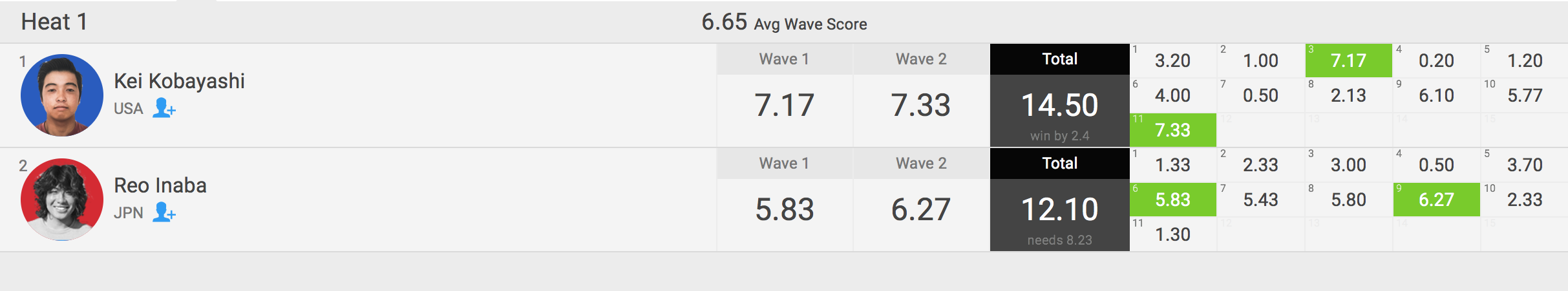クォーターファイナルのヒート1では小林桂と稲葉玲王との日本人対決となり、トータルスコア14.ptをスコアした小林桂に軍配が上がった。
