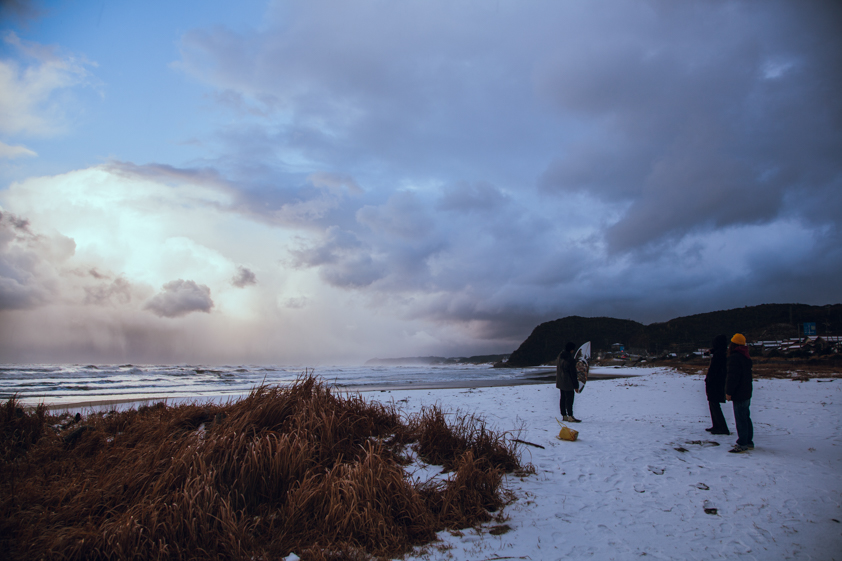 このメンバーで吹雪吹き荒れる中、夜中のうちに移動し朝からうねりの状態や風をチェックし鳥取、京都、福井と回らせていただいた。