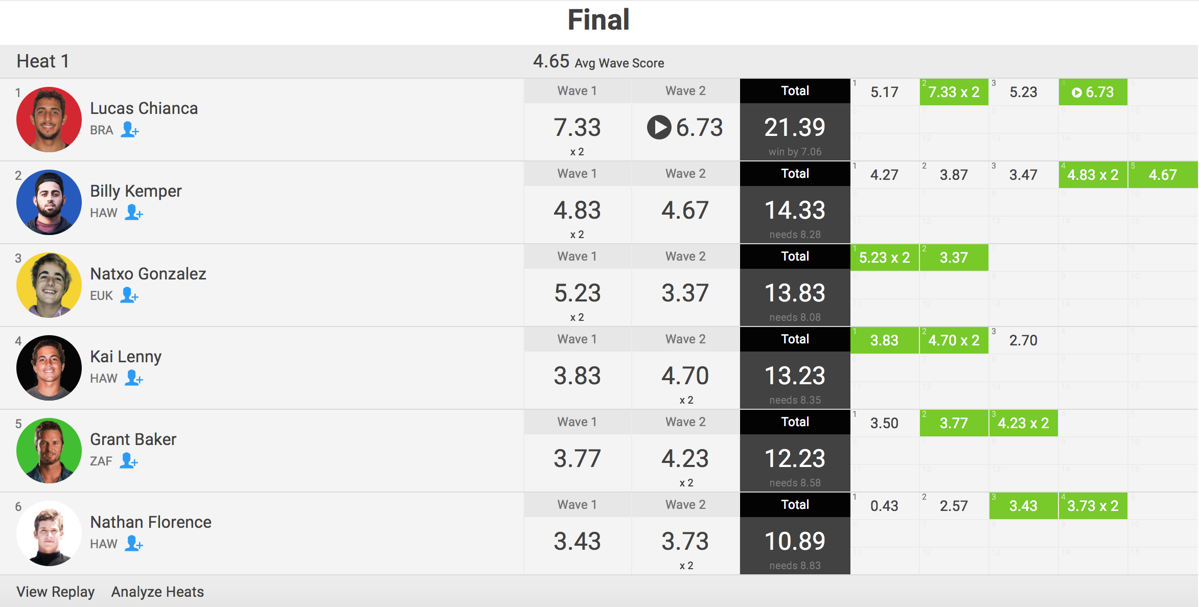 ワールドチャンプのMakua Rothman(HAW)がラウンド1のヒート3で、今大会のディフェンディング・チャンピオンであるJamie Mitchell(AUS)と、JAWSで行われたビッグウェイブツアーBWT”Pe’ahi Challenge”で見事優勝を果たしたIan Walsh(HAW)がセミファイナルで敗退するという大波乱が巻き起こる。