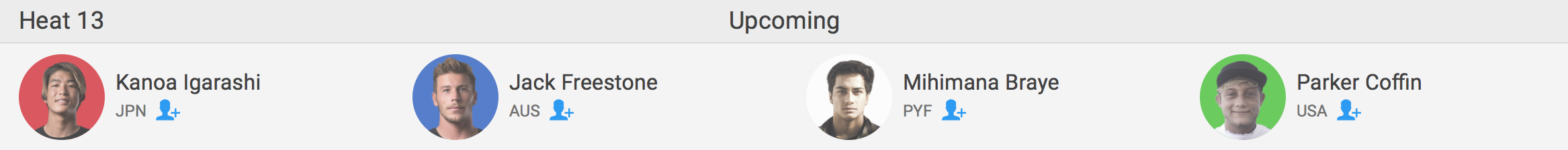 注目のカノア五十嵐はヒート13でJack Freestone(AUS)、Mihimana Braye(PYF)、Parker Coffin(USA)と対戦予定。