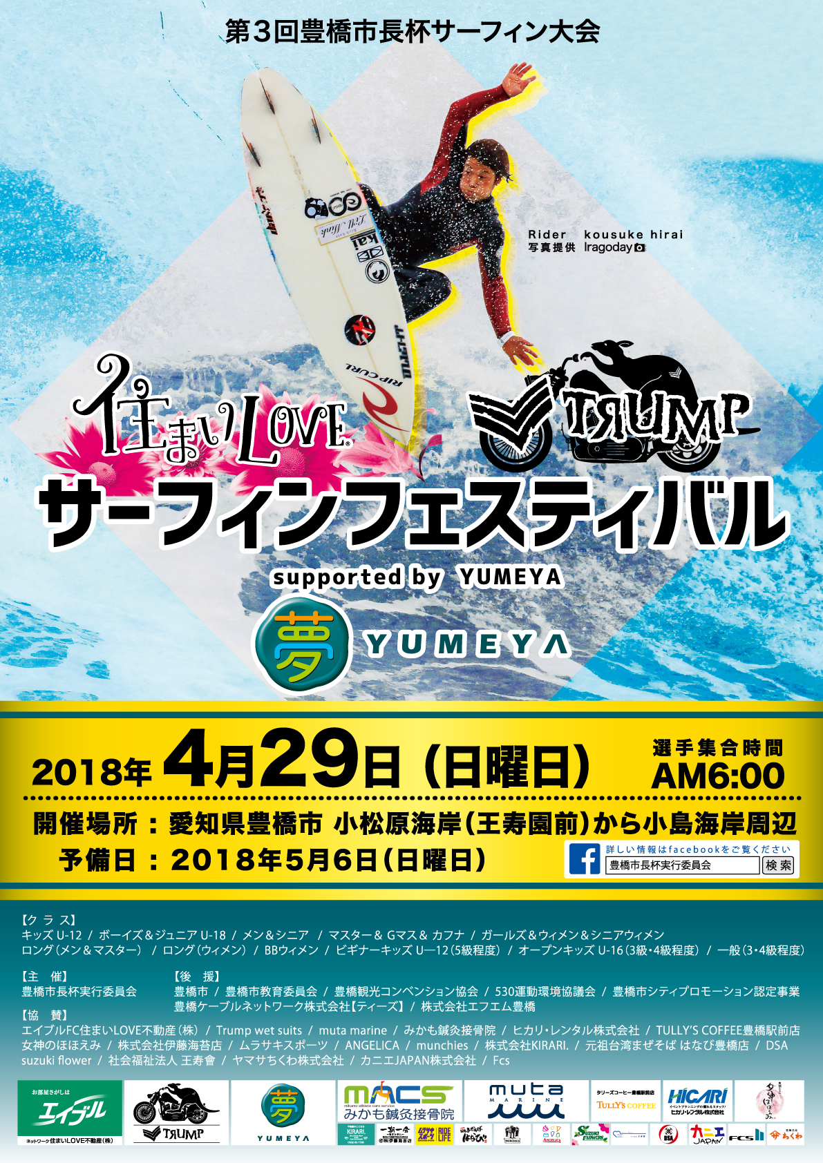 4/29(日)に愛知県の小松原海岸(王寿園前)にて開催されるNSA AAランク第三回豊橋市長杯サーフィン大会 住まいLOVE & TRUMPサーフィンフェスティバル supported by YUMEYAが3/5(月)よりいよいよエントリー開始!