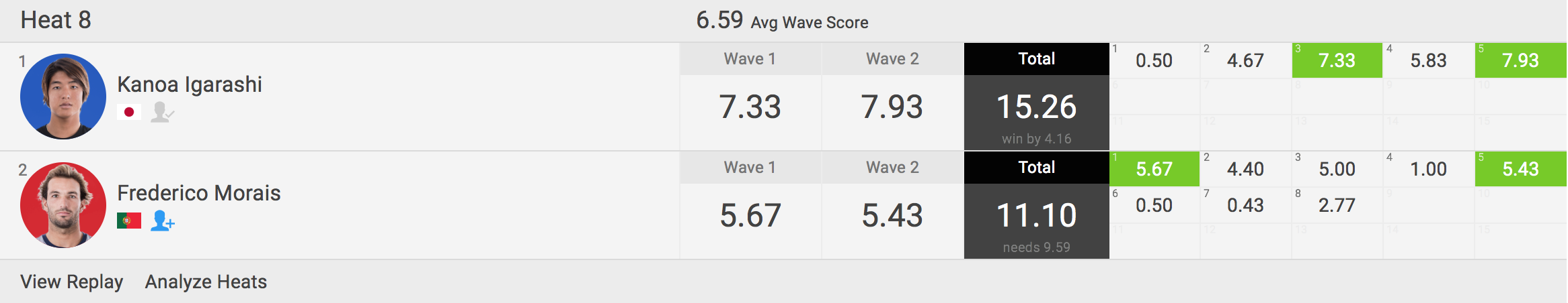そんな中で迎えたカノア五十嵐(JPN)とFrederico Morais(PRT)の一騎打ちとなるラウンド3のヒート8では、序盤Frederico Moraisが5pt代のミッドスコアを2本まとめてリードを測るも、中盤に差し掛かったところでカノア五十嵐がつかんだ3本目の波で7.33ptをマークすると、5本目につかんだ波では深いチューブをメイクして7.93ptをスコア!