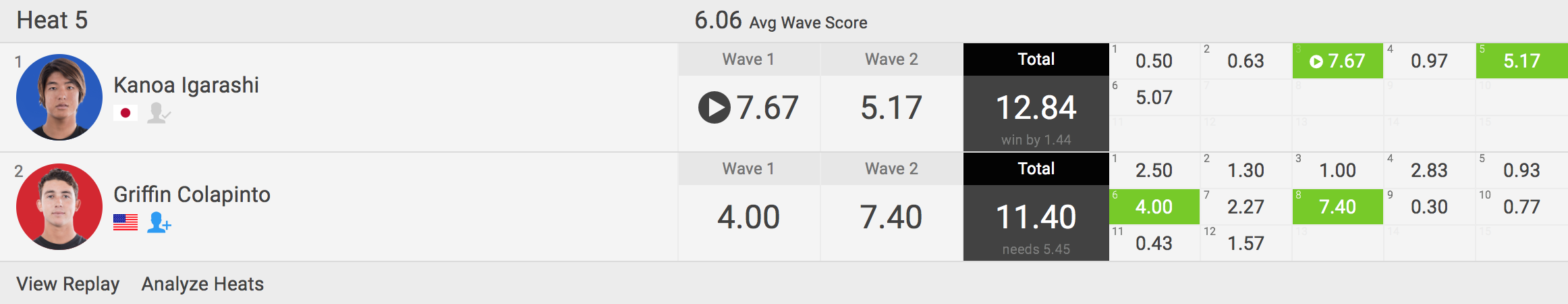 逆転を狙うGriffin Colapintoも8本目の波で高さのあるテールハイ・エアリバースをメイクして7.40ptをマークするが逆転には至らず、見事カノア五十嵐がラウンド4進出を果たした!