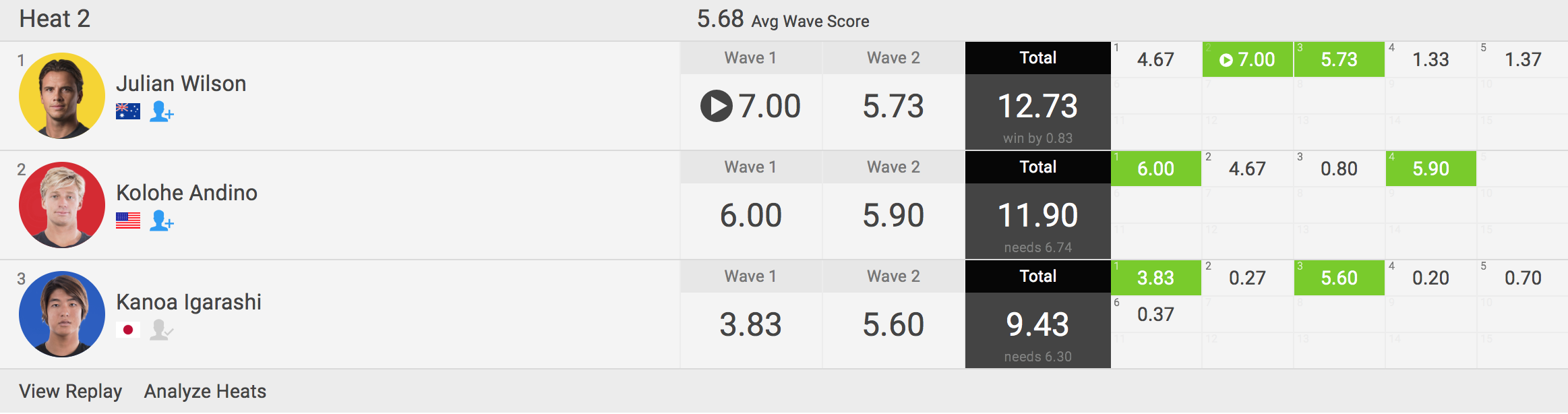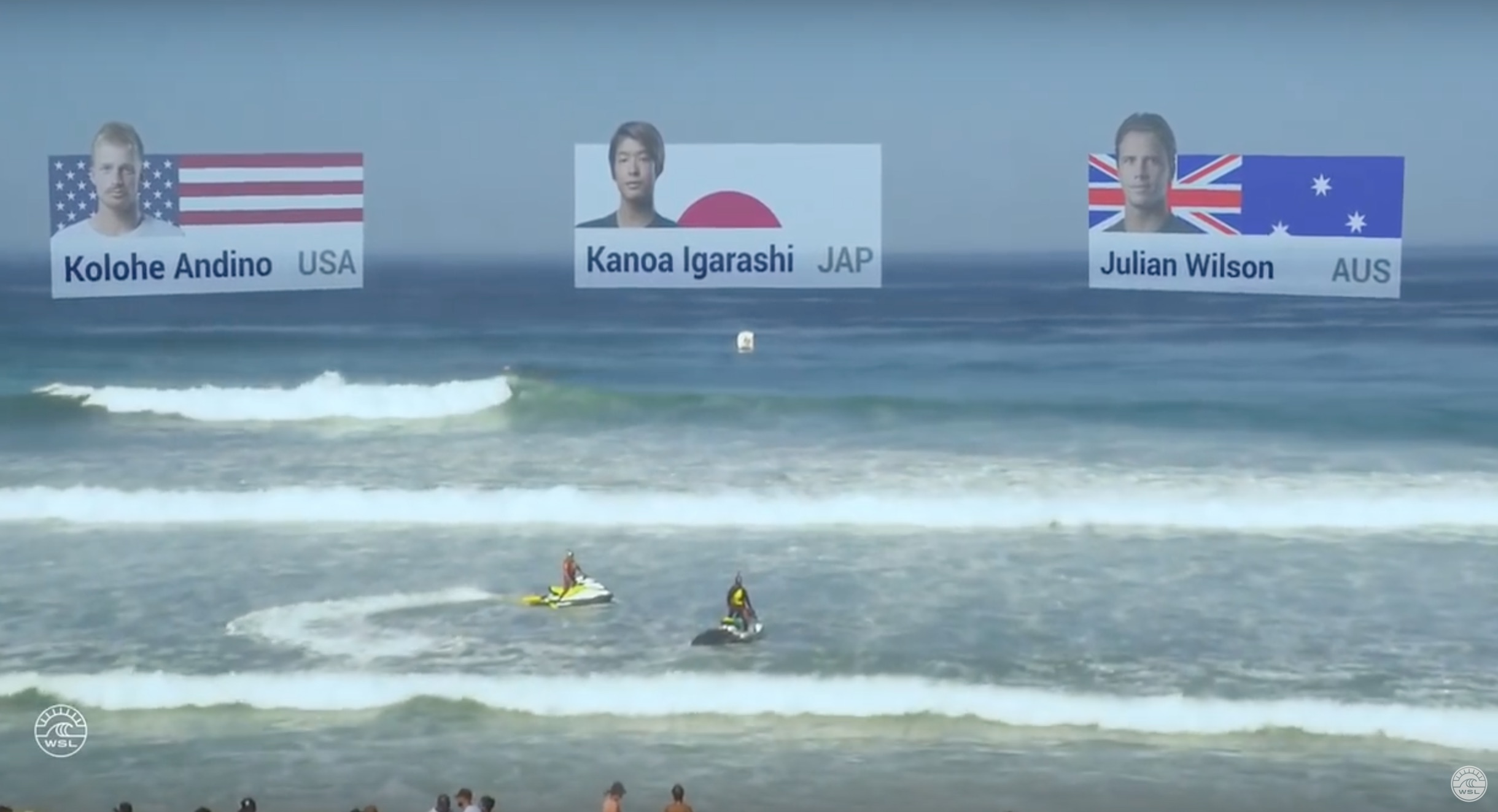 注目の日本代表選手カノア五十嵐はラウンド4のヒート2でJulian Wilson(AUS)とKolohe Andino(USA)と対戦。