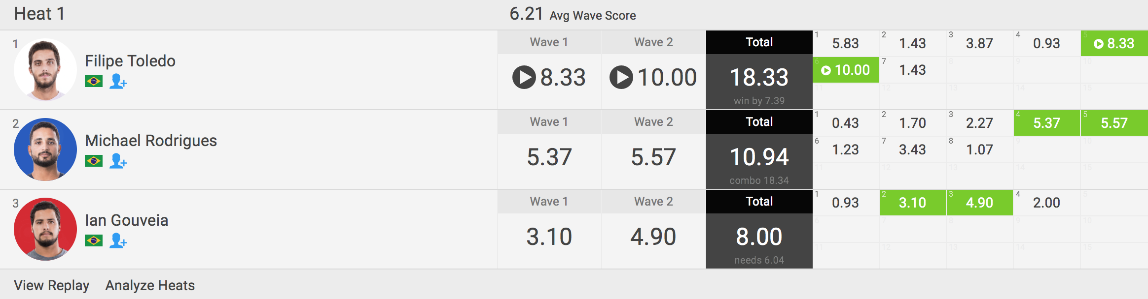さらにMENSで注目すべきはラウンド4のヒート1でFilipe Toledo(BRA)が披露したバックサイド・フルローテーションエア1発での10ptライド。