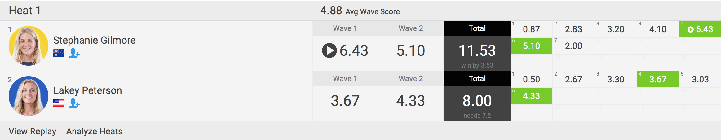 いい波が少なく、両選手ともに思うようにスコアを伸ばせない中、Stepanie Gilmoreが5本目に掴んだレギュラーの波でレイバックを最後にメイクして6.43ptをスコア!