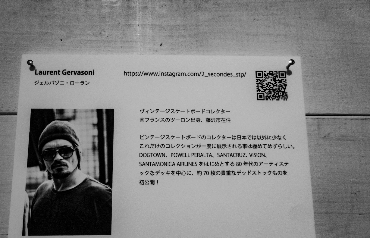 展示作品は全てフランス出身で藤沢在住のLaurent Gervasoniさんによるコレクションとなっており、Tony Hawk、Tommy Guerrero、Steve Caballero、Mike Vallely、Jason Jessieを含めた数々のシグネイチャー・モデルは全てレプリカでなく本物だというから驚き。