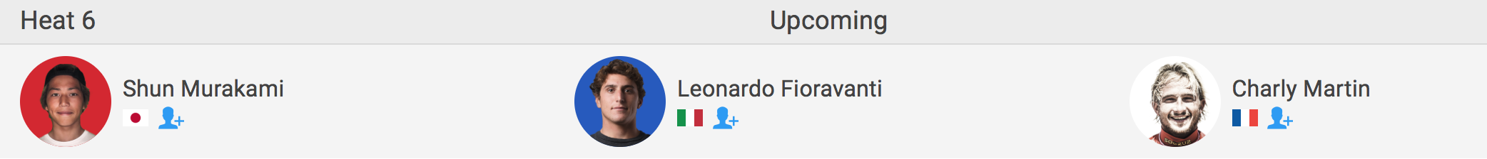 ラウンドアップを果たした日本人選手である村上舜は、迎えるラウンド4のヒート6で元CTサーファーのLeonardo Fioravanti(ITA)、Charly Martin(FRA)と対戦予定。