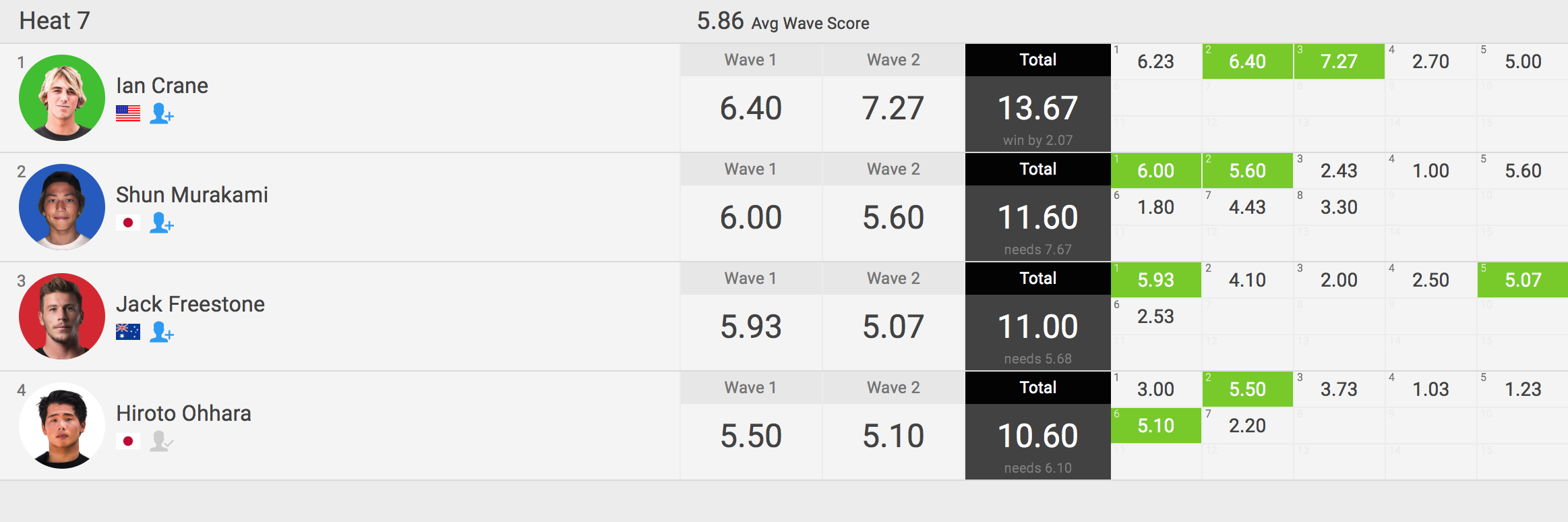 注目の日本人選手の活躍は、ラウンド3のヒート7で大原洋人と同じヒートに出場となった村上舜が、オープニングウェイブから6.00ptをマークしてバックアップに5.60ptをまとめ、見事WJCジュニアワールドチャンプで元CTサーファーのJack Freestoneを抑え、2位でラウンドアップを果たした!