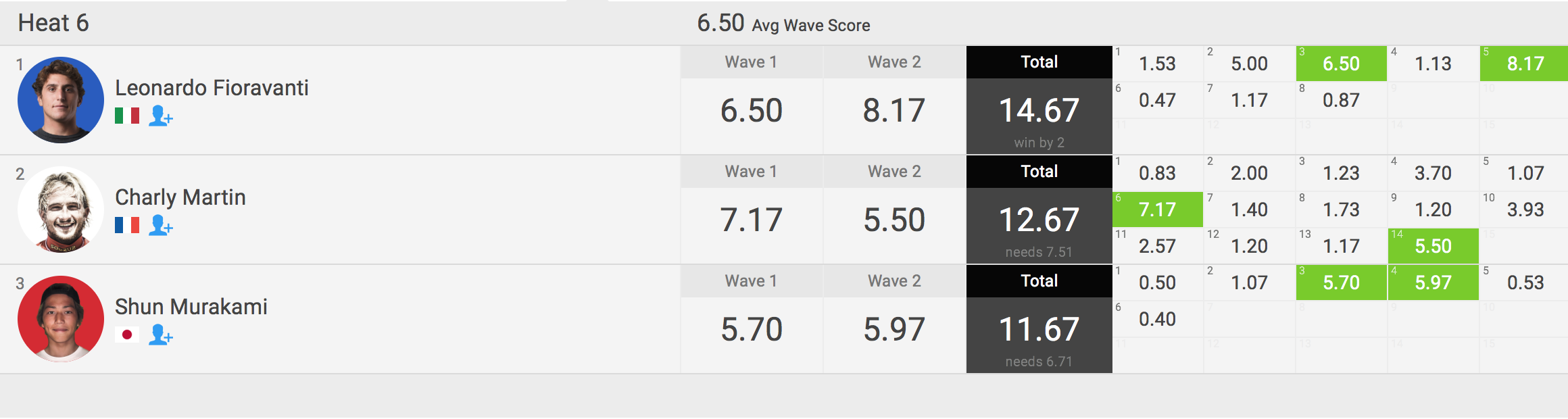 注目の日本人選手の活躍はラウンド4のヒート6でLeonardo Fioravanti(ITA)、Charly Martin(FRA)と対戦した村上舜が、ヒート終盤まで2位のポジションをキープするも、Charly Martinに逆転され惜しくもここで敗退。