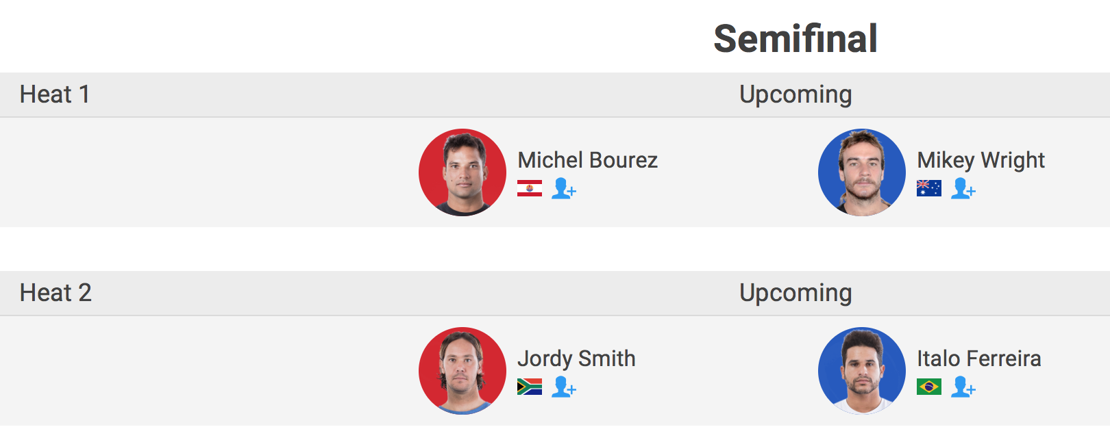 迎えるセミファイナルはヒート1でMichel Bourez(PYF)とMikey Wright(AUS)、ヒート2ではJordy Smith(ZAF)とItalo Ferreiraが対戦予定。