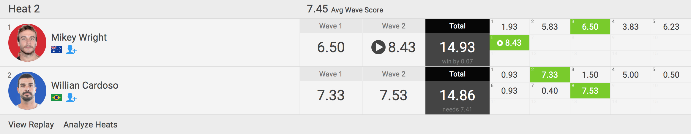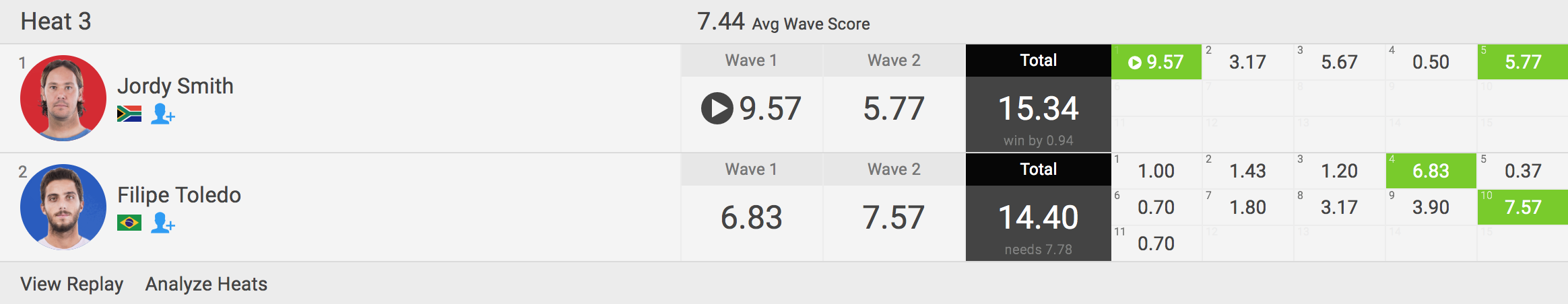 さらにヒート2ではワイルドカードで本イベントに出場のMikey Wright(AUS)がWilliam Cardoso(BRA)を下し、続くヒート3ではワールドチャンピオンを狙うJorsy Smith(ZAF)がブラジルでのCT第4戦で無敵の強さを見せつけたFilipe Toledo(BRA)を粉砕。