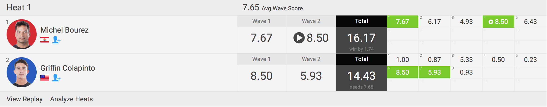 MENSクォーターファイナルは、ヒート1から注目のスーパールーキーGriffin Colapinto(USA)とMichel Bourez(PYF)がエキサイティングな戦いを展開。