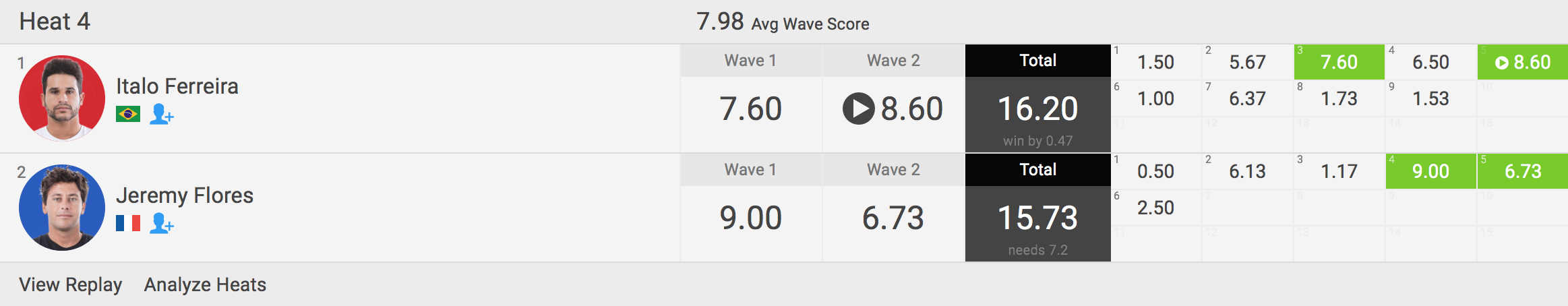 最終ヒートとなるヒート4ではItalo Ferreira(BRA)を相手にJeremy Flores(FRA)が4本目の波でディープチューブを駆け抜けて9.00ptをマークすると5本目の波で6.73ptをスコアしてわずか0.47pt差まで詰め寄るも惜しくも逆転ならずといった最後まで手に汗握る戦いをみせた!