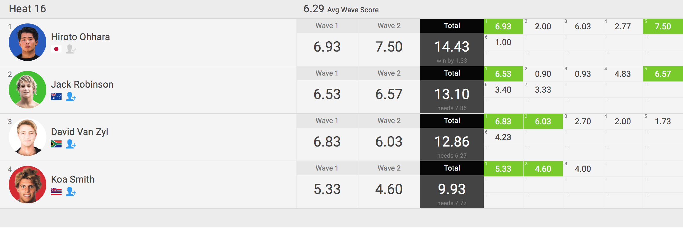 注目の大原洋人はラウンド2のヒート16でJack Robinson(AUS)、David Van Zyl(ZAF)、Koa Smith(HAW)と対戦。