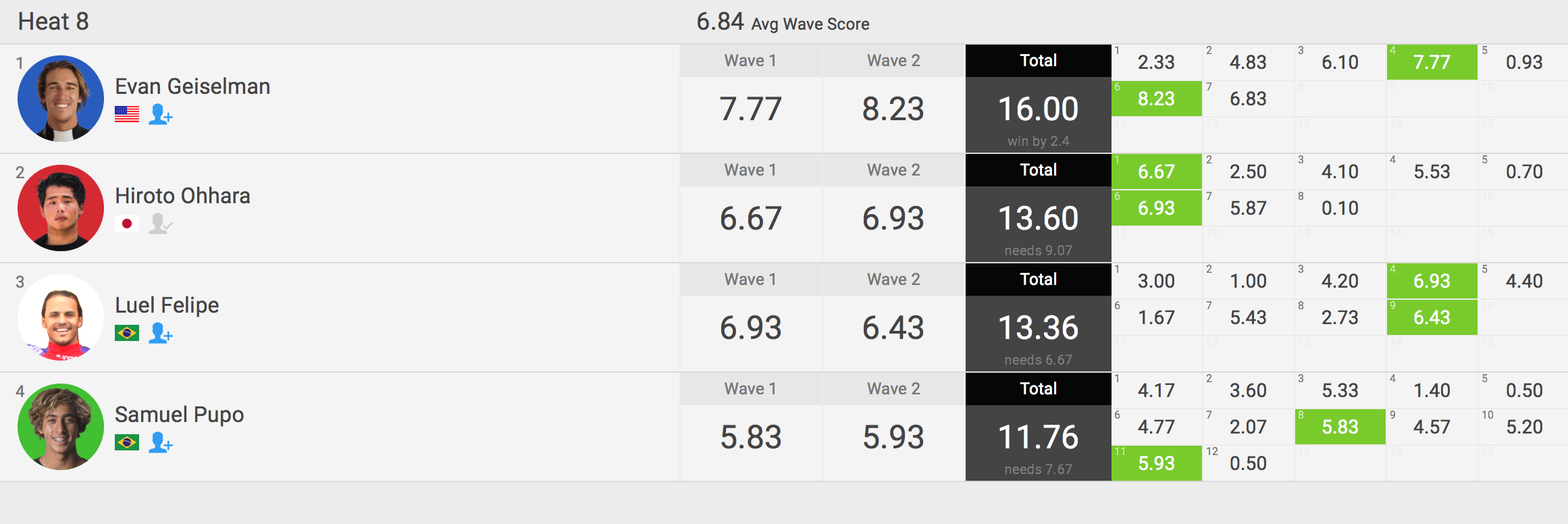 注目の日本人選手の活躍はラウンド3のヒート8に出場の大原洋人がLuel Felipe(BRA)と Samuel Pupo(BRA)といった2名のブラジリアンを抑えてEvan Geiselmanに次いで2位で勝ち上がったと共に、