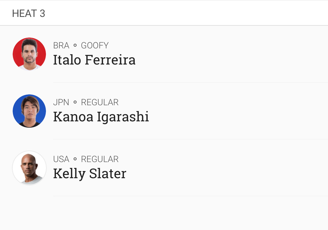 注目のカノア五十嵐はラウンド1のヒート3に組み込まれ、ブラジルのItalo Ferreiraに加え、長らく休養期間をとっていたキングKelly Slaterと対戦。