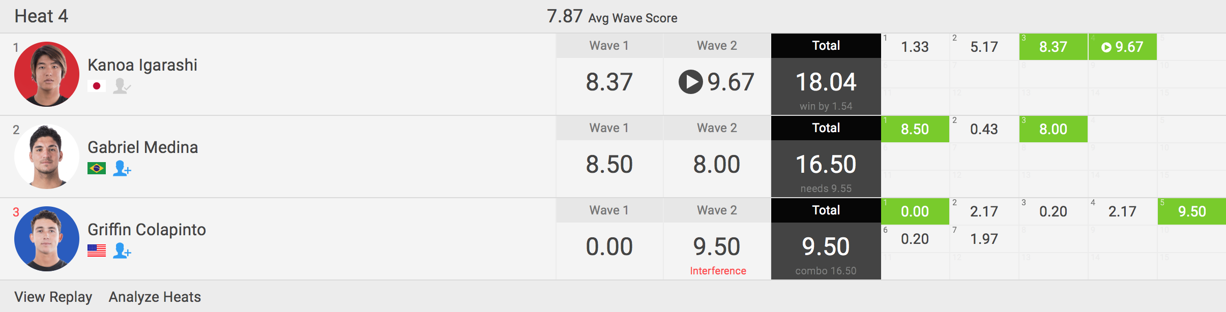 3人ヒートとなるラウンド4のヒート4ではスーパールーキーGriffin ColapintoとワールドチャンプGabriel Medinaといった強豪2名を相手に、8.37ptと、この日のハイエストスコアとなる9.67ptといった2本のエクセレントスコアを重ねてトータルスコア18.04ptをマーク!!