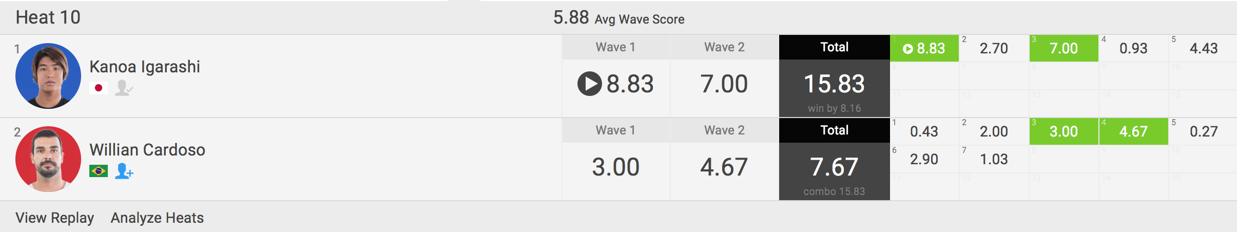 注目の日本代表選手である五十嵐カノアはラウンド3でバリのウルワツで開催されたCTで優勝を果たしたルーキーWillian Cardosoを相手に、8.83ptと7.00ptのトータルスコア15.83ptを叩き出してコンビネーション・シチュエーションに追い込み、見事ラウンド4へ進出!