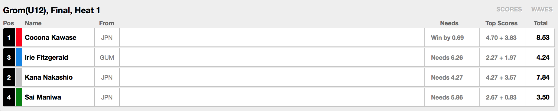 セミファイナルでは7.17ptを叩き出し、絶好調なサーフィンをみせていた渡邊壱孔、先手必勝の作戦でヒート開始早々波を掴んだ寺田文太、四国出身のスーパーキッズ辻岡堅太郎と、波を掴めば誰が優勝してもおかしくない状況の中、ヒート前半に5.33ptと6.83ptをスコアしたKai Kushnerが優勝をさらった!