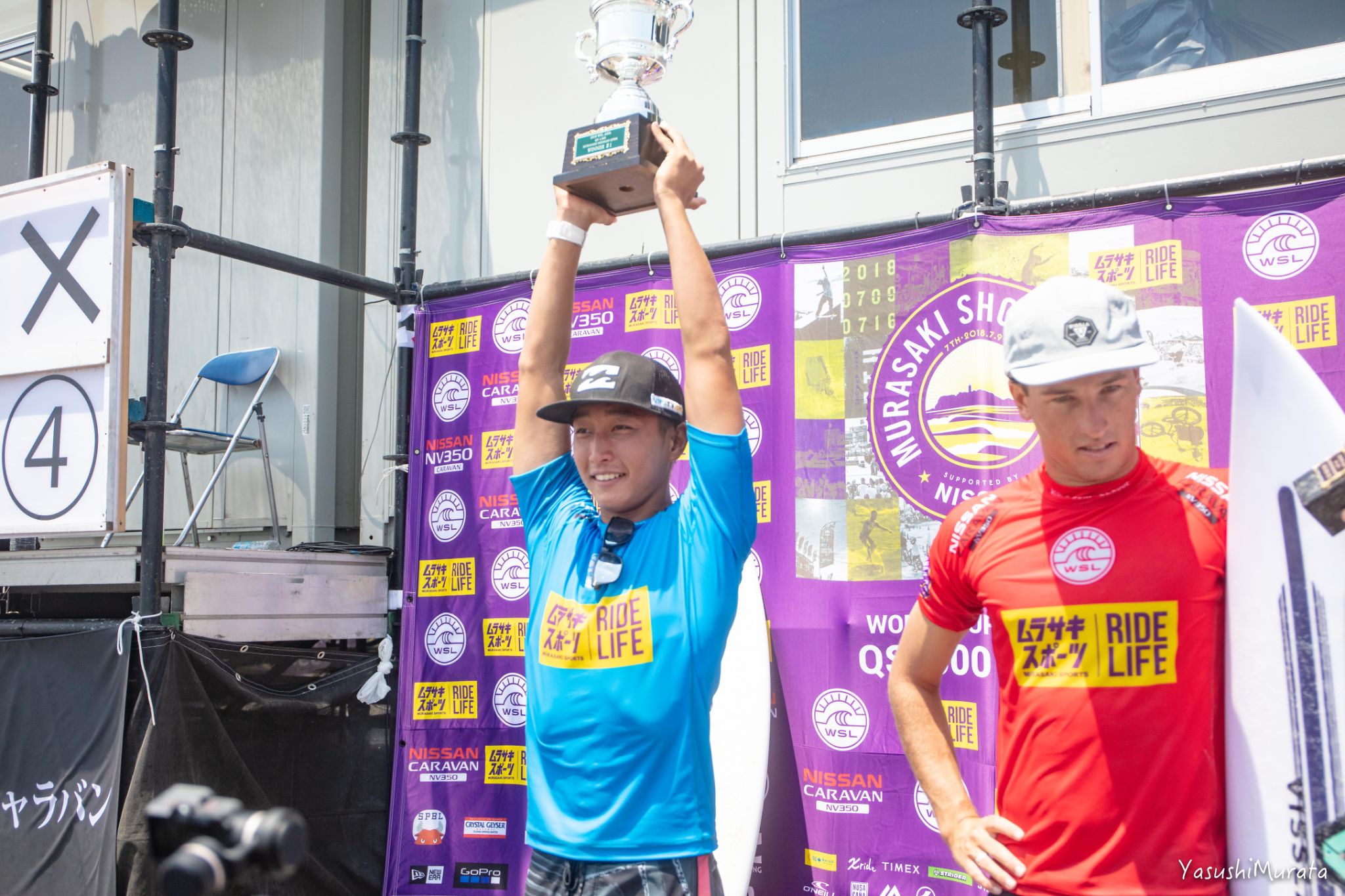 が、ヒート中盤を過ぎた頃にGarden Lawlerが4本目に掴んだ波で4.00ptをマークすると、一度逆転1位におどり出るが、安室丈が4本目の波で4.90ptを叩き出してバックアップスコアをあげると再び1位となり、見事QS1500”ムラサキ湘南オープン”l置いて優勝を飾った!!