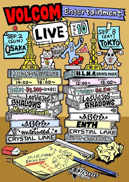 出演バンドにVietos、SHADOWS、CRYSTAL LAKE、ABOS、Mighty Crown、waterweedといった豪華な顔ぶれがラインナップする中、会場にはVOLCOMランプが設置され、スケートボードを持参すれば1ドリンクフリー、ランプでのフリースケートが楽しめるというVOLCOMならではの1粒で2度美味しいイベントとなっている。