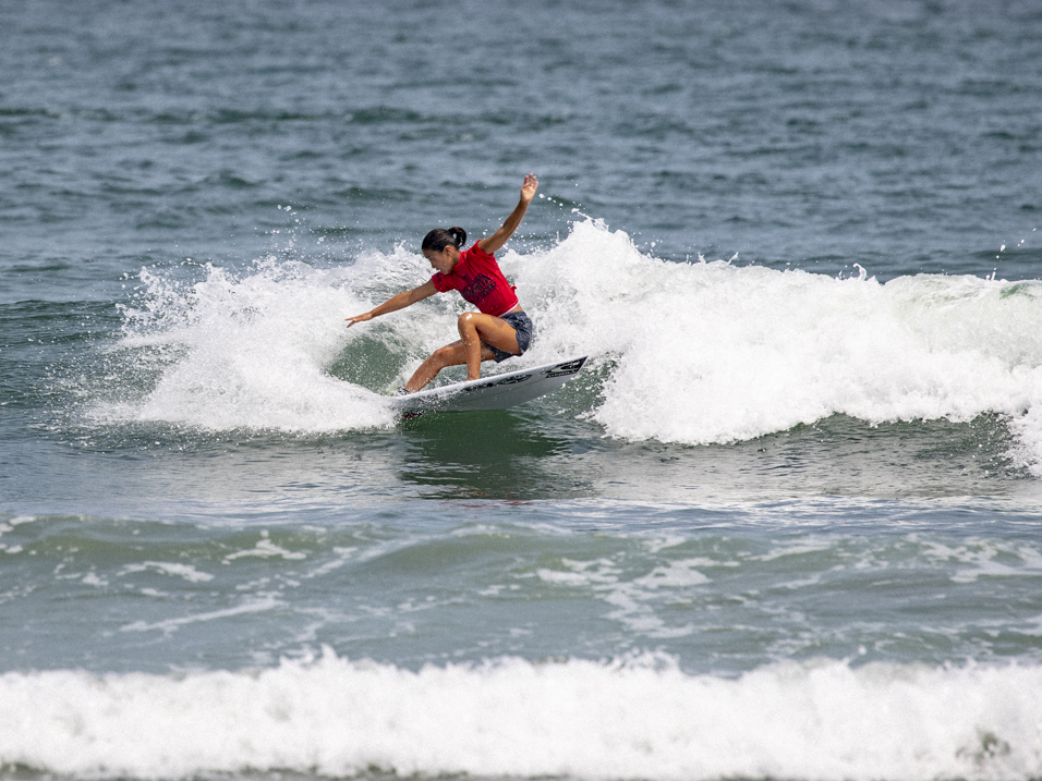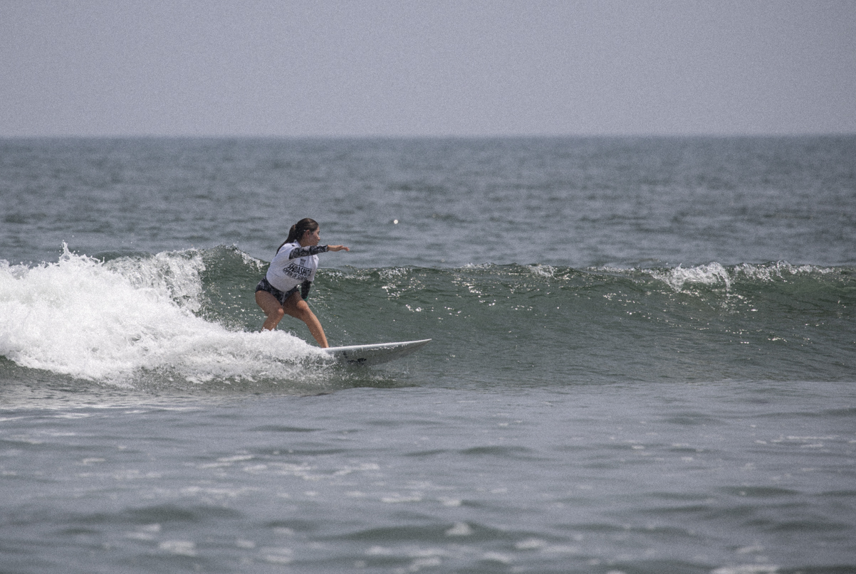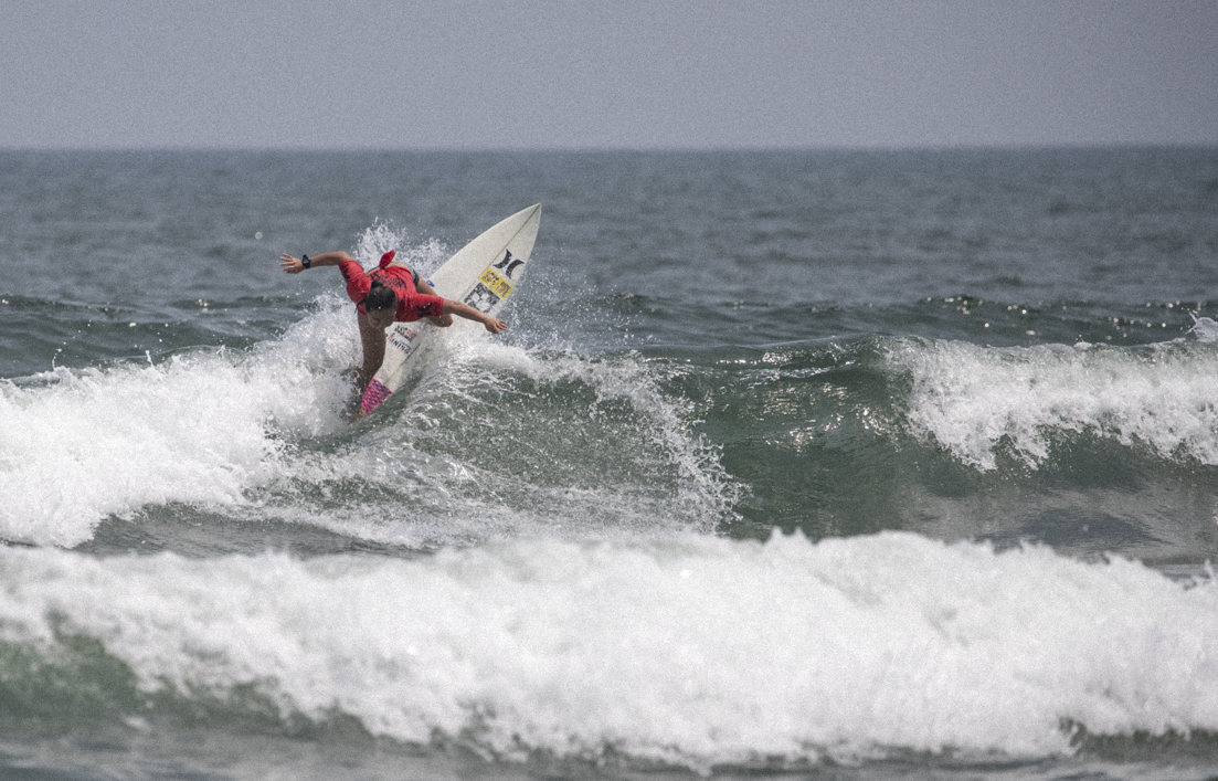 綺麗なボトムターンから繰り出されるリップアクションを武器に難なくファイナル進出を果たしたが、ファイナルでは海とのリズムを合わせることができず4位となった松永莉奈。馬庭彩と同じく伊良湖のJPSAでトライアルラウンドからファイナル進出を果たし、プロ資格を獲得した実力を持つ鬼要チェックなガールズサーファーのひとり。Rina Matsunaga.