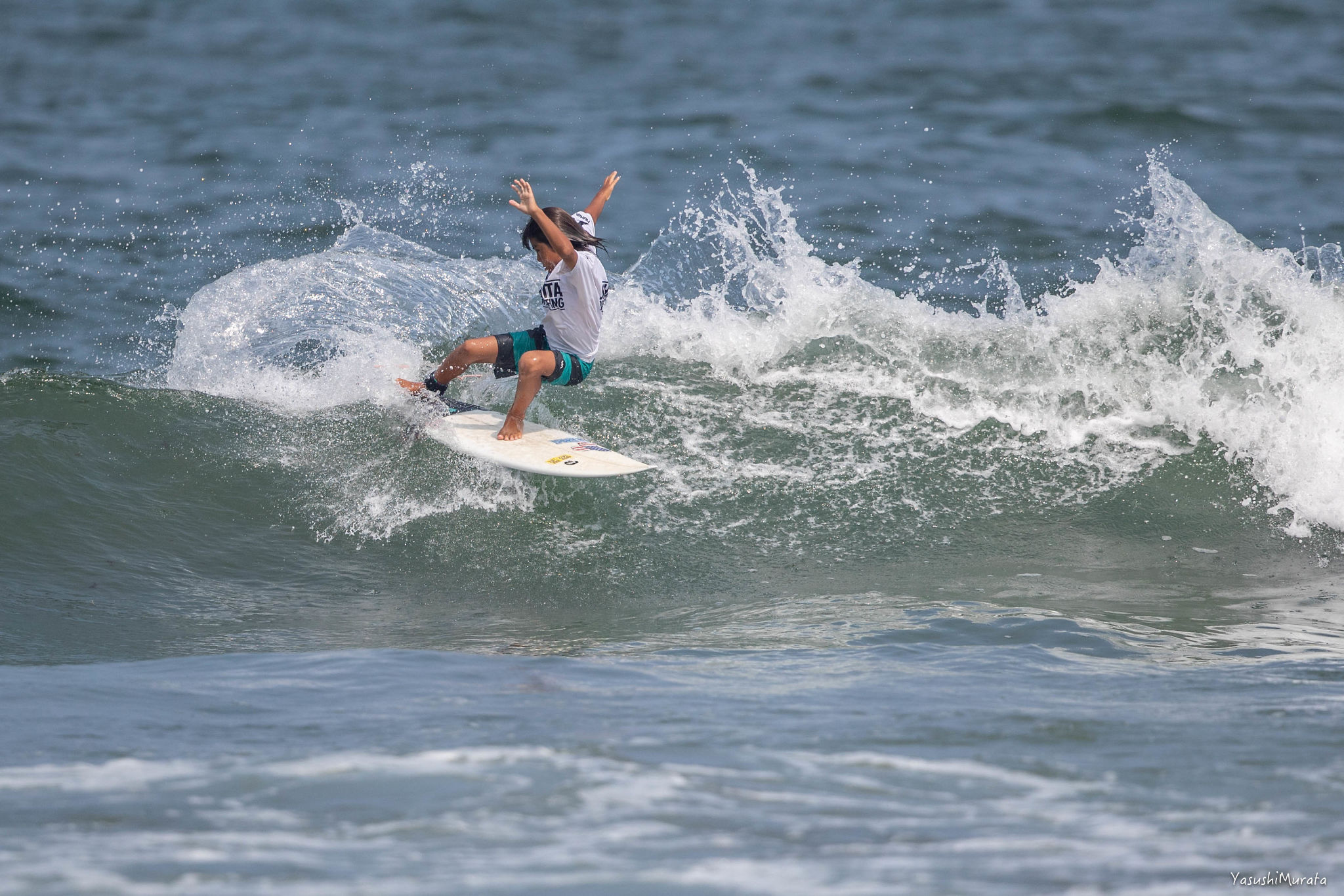 ファイナル後半戦に掴んだレギュラーの波がハイスコアに繋がったが、バックアップをまとめ切ることができず、ジュニアクラス2位となった照屋凛助。Rinsuke Teruya.