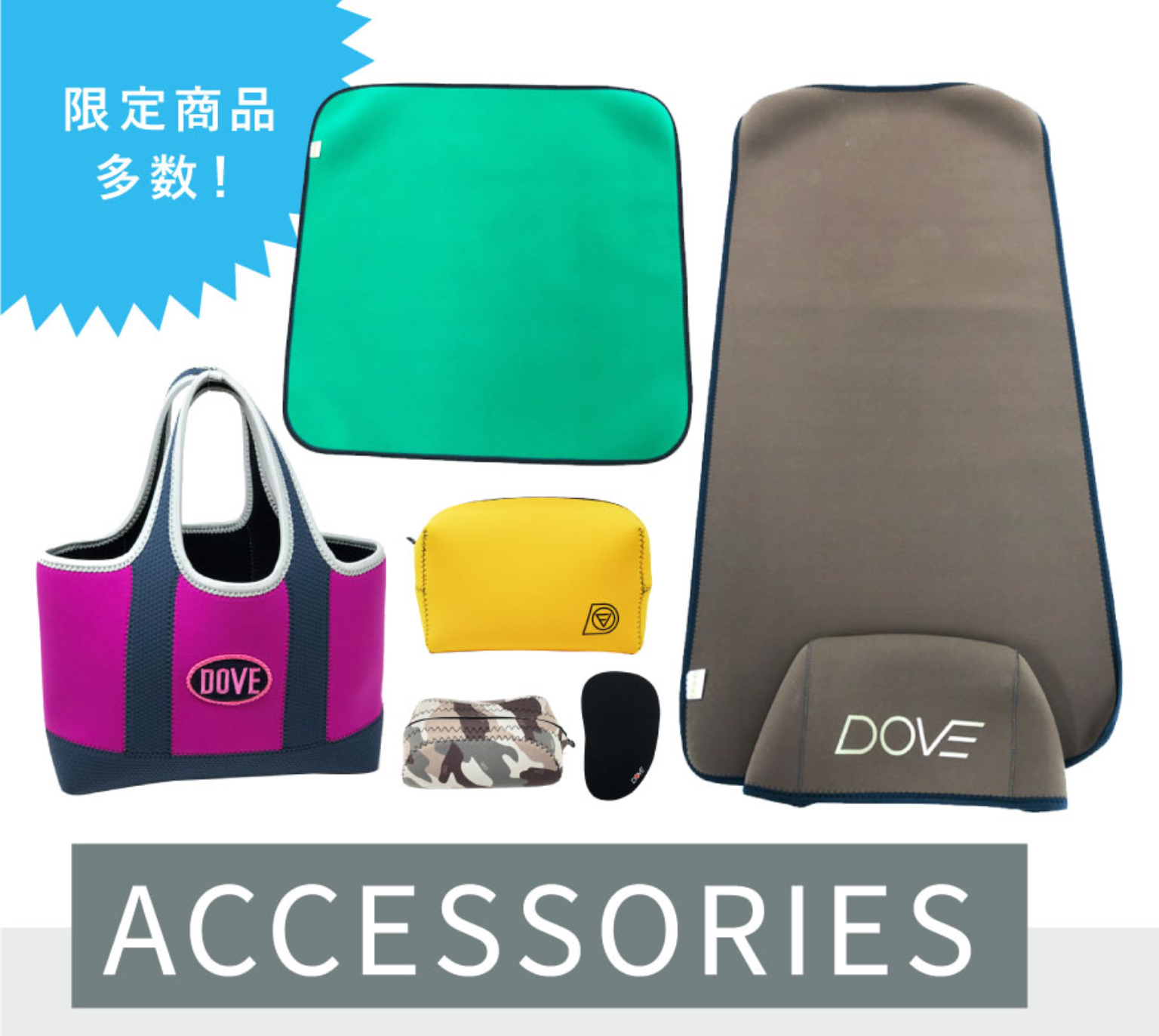 さらに現在DOVEオフィシャルサイトでは、ECOを目的に、ウエットスーツの切れ端を利用した手作りの1点ものとなるDOVEオリジナル小物や便利グッズなどを展開中!