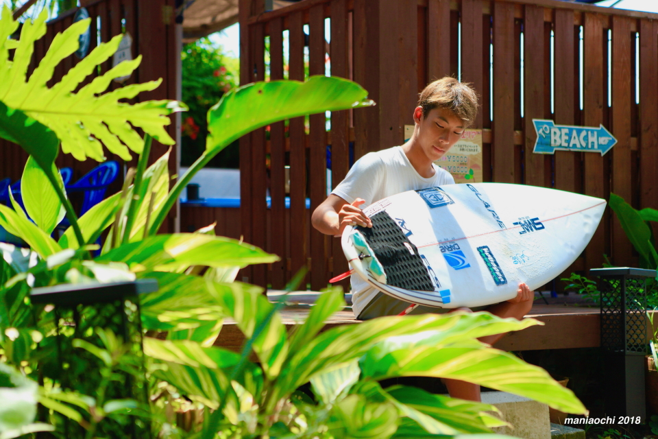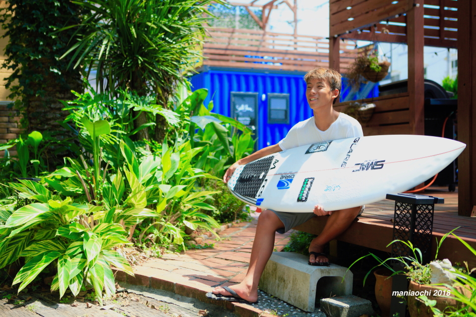 彼のホームビーチでもある高知県は生見海岸にある海まで徒歩1分という素晴らしい立地のペンション サウスシュアー のオーナーでもありサーファーでもある金沢 直一さんの息子で抜群のサーフィンファミリーの環境で育った金沢 呂偉プロ。
