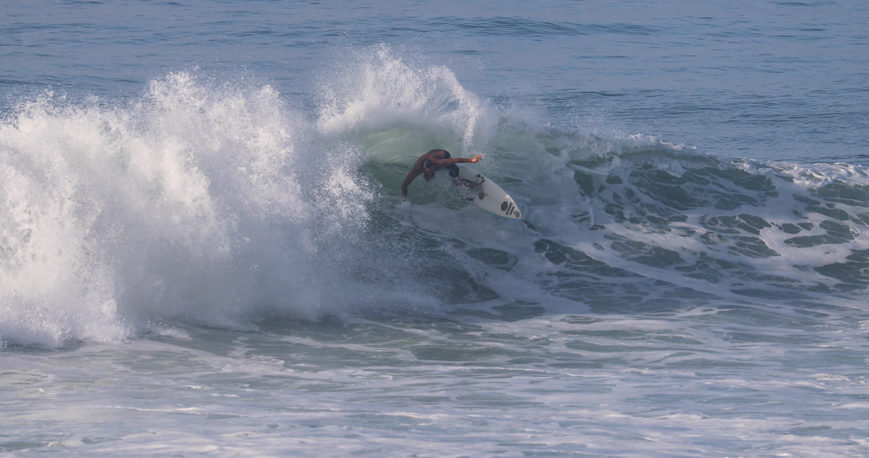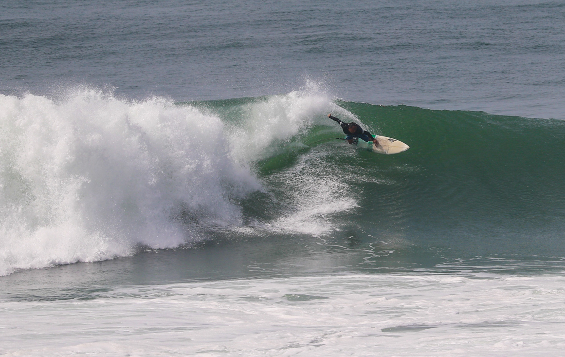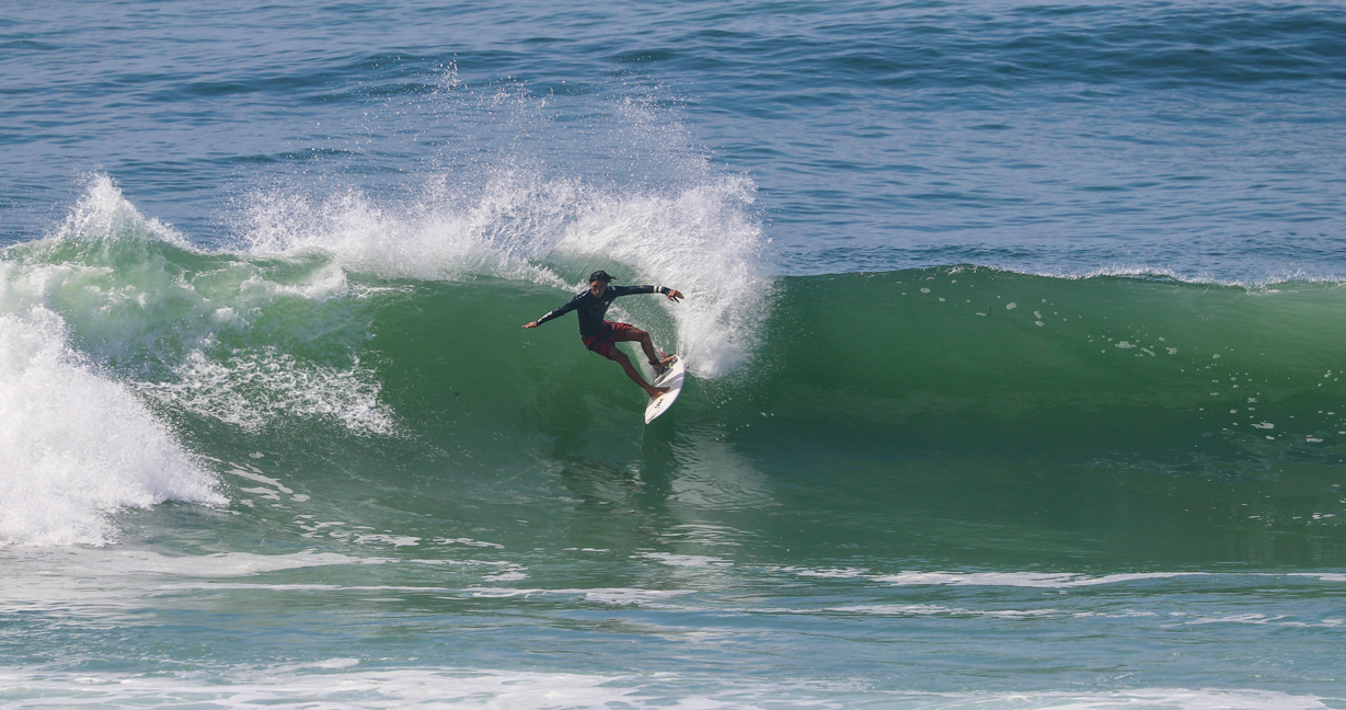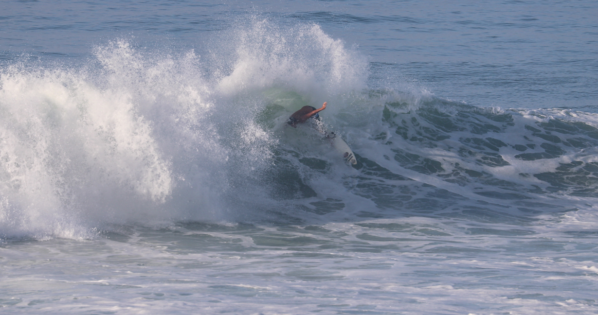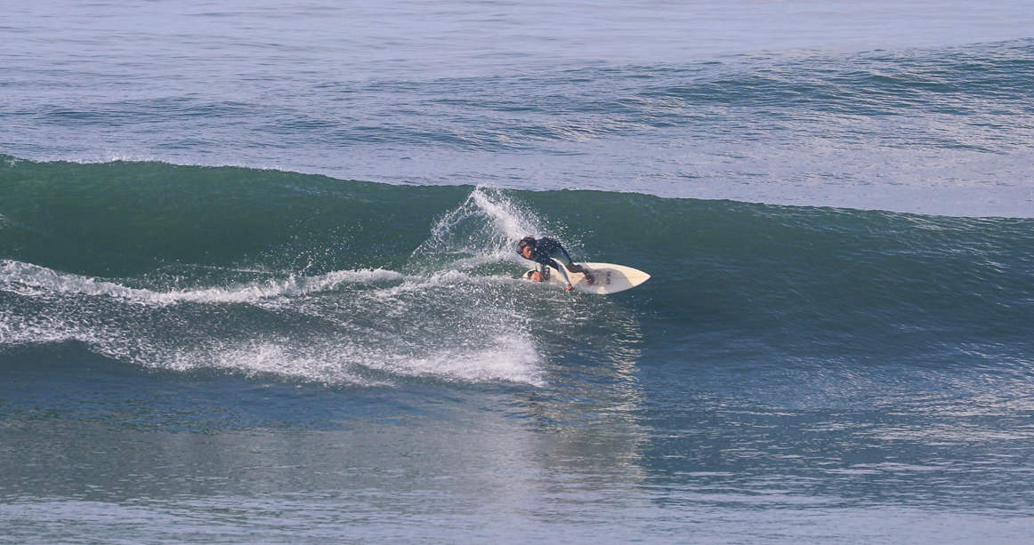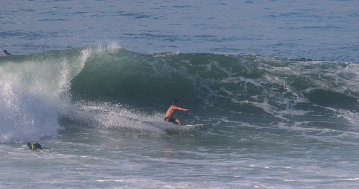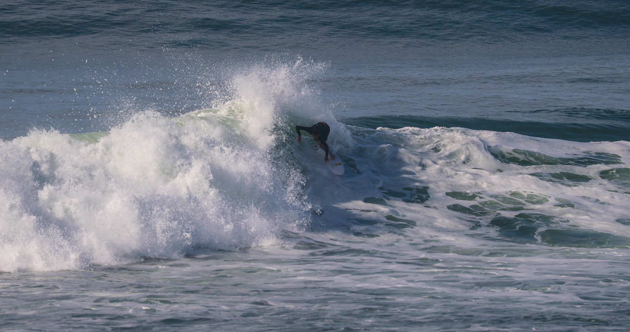 オンショアが吹く寸前1時間前くらいにゲッティングアウトして行き、さすがの存在感で沖からのセットをつかんでビッグドロップをメイクする。
