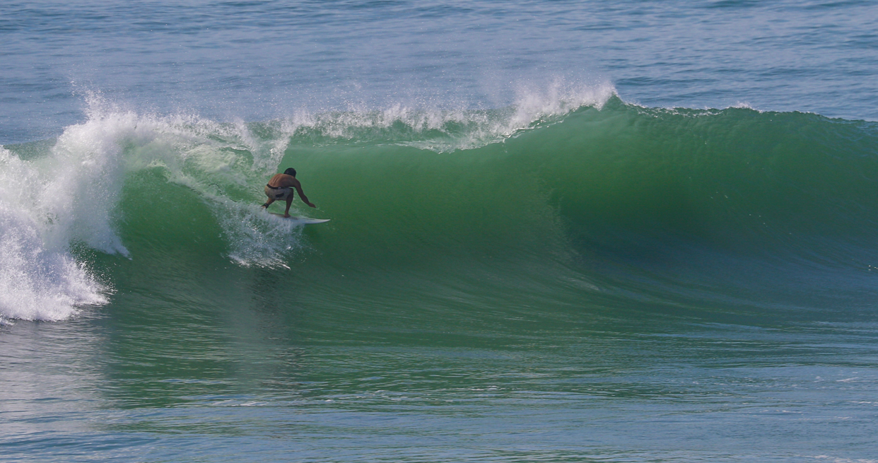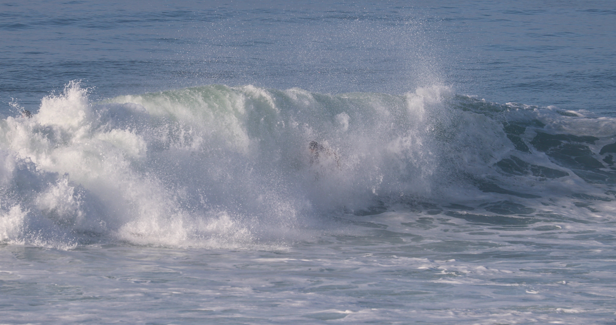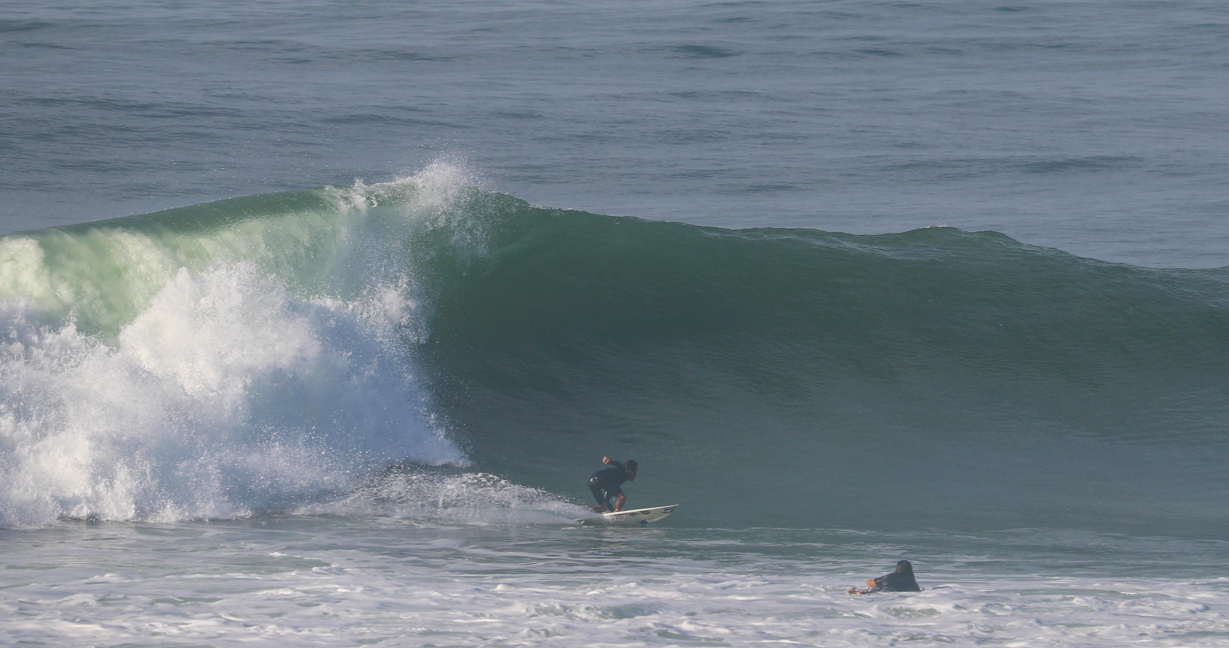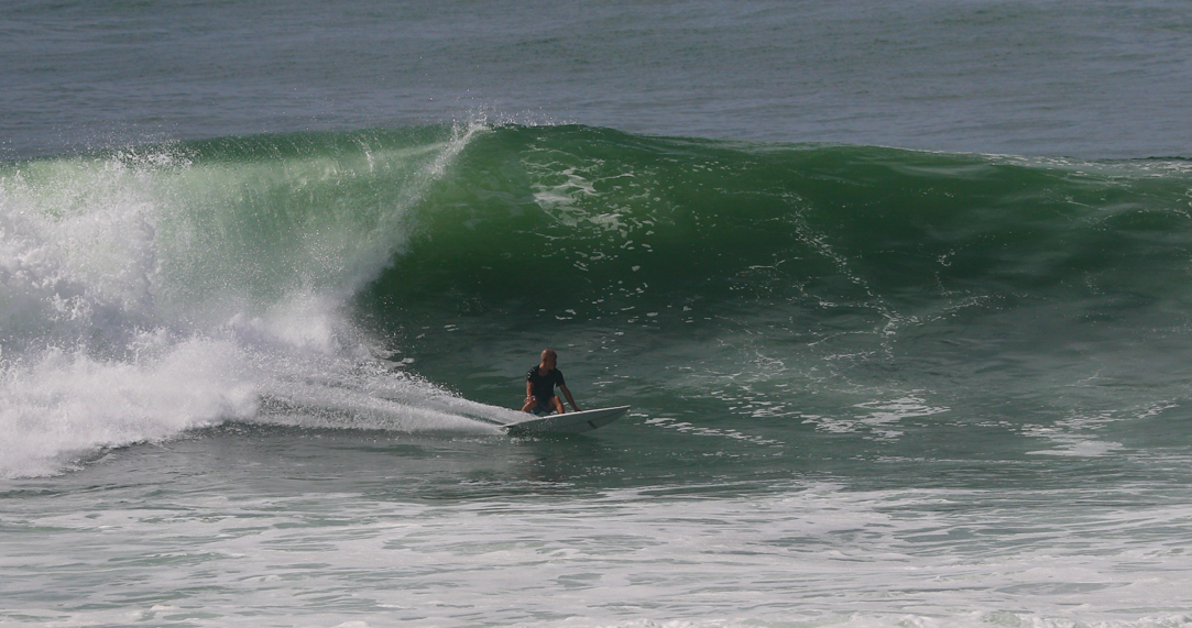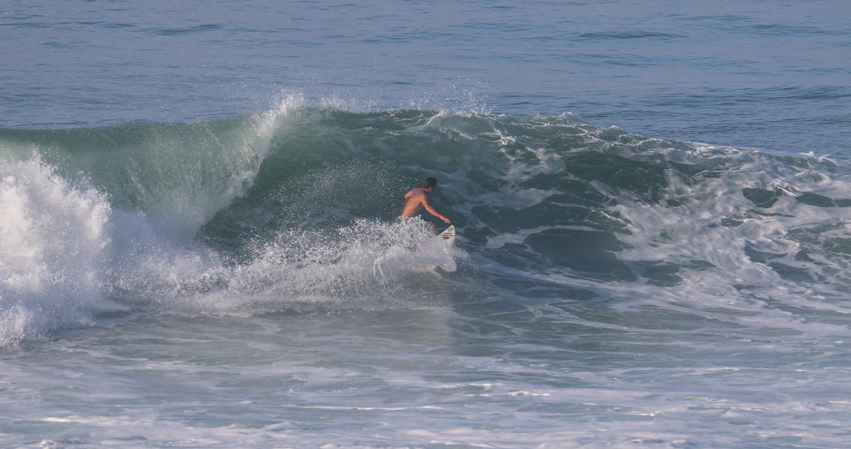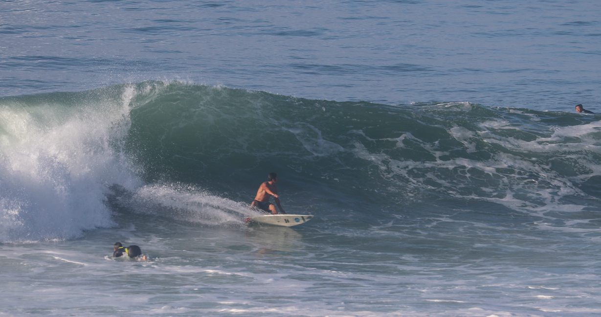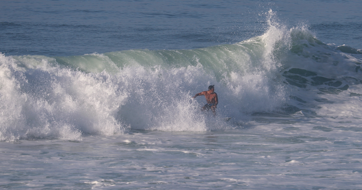 オンショアが吹く寸前1時間前くらいにゲッティングアウトして行き、さすがの存在感で沖からのセットをつかんでビッグドロップをメイクする。
