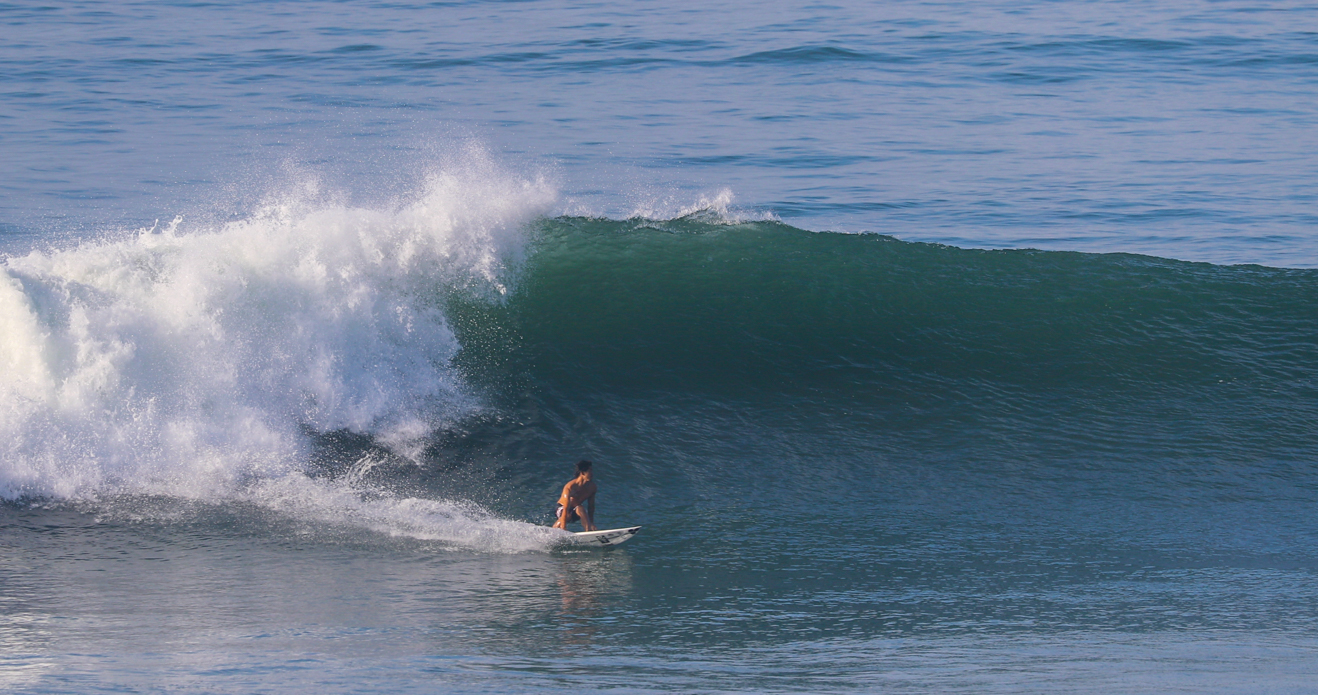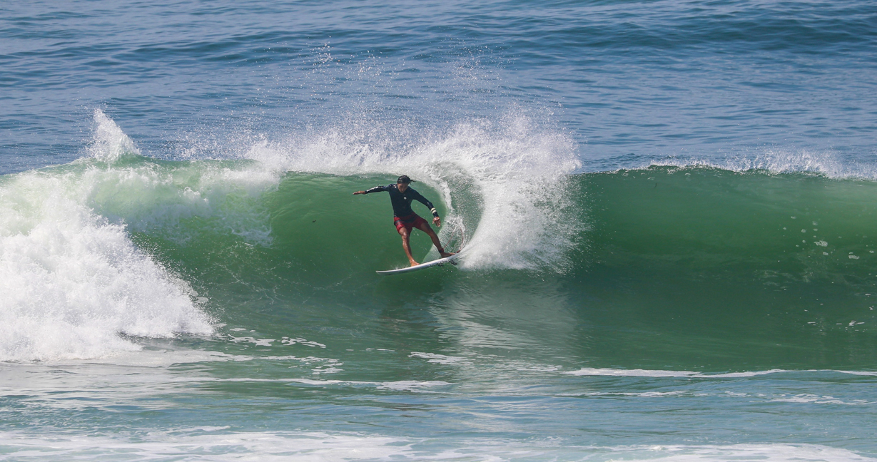 この日は沖からブレイクするサイズのあるセットに狙いを定め、自らシェイプしたボードでこのクラシカルリーフの波を攻めていた。
