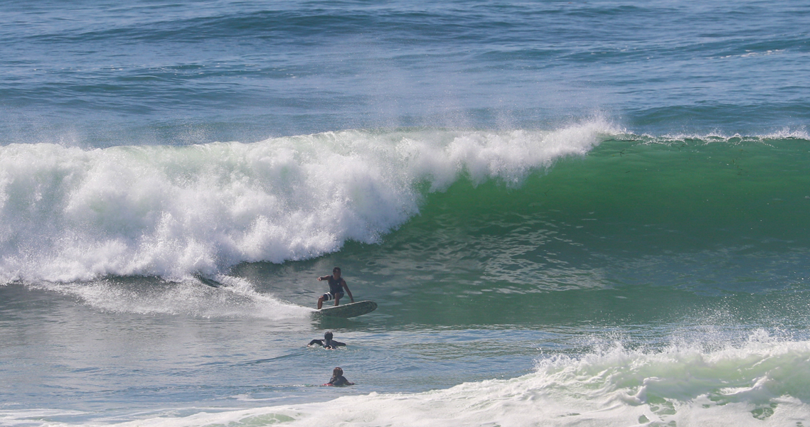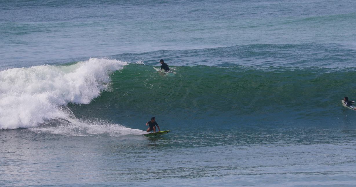 前日に吹いた強いオンショアの影響でせっかくのグランドスウェルがまとまりない状態ながら、湘南イーストサイドのリーフブレイクは比較的グッドコンディションとなった。