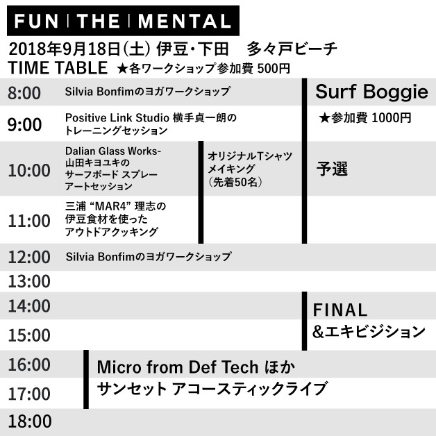 定員は先着順で50名様、性別年齢問わずエントリー可能です(※プロサーファーは参加不可)。エントリー費として、当日1,000円を徴収させていただきます。なおエントリーは、FunTheMental Facebookメッセージまで事前の連絡をお願いいたします。