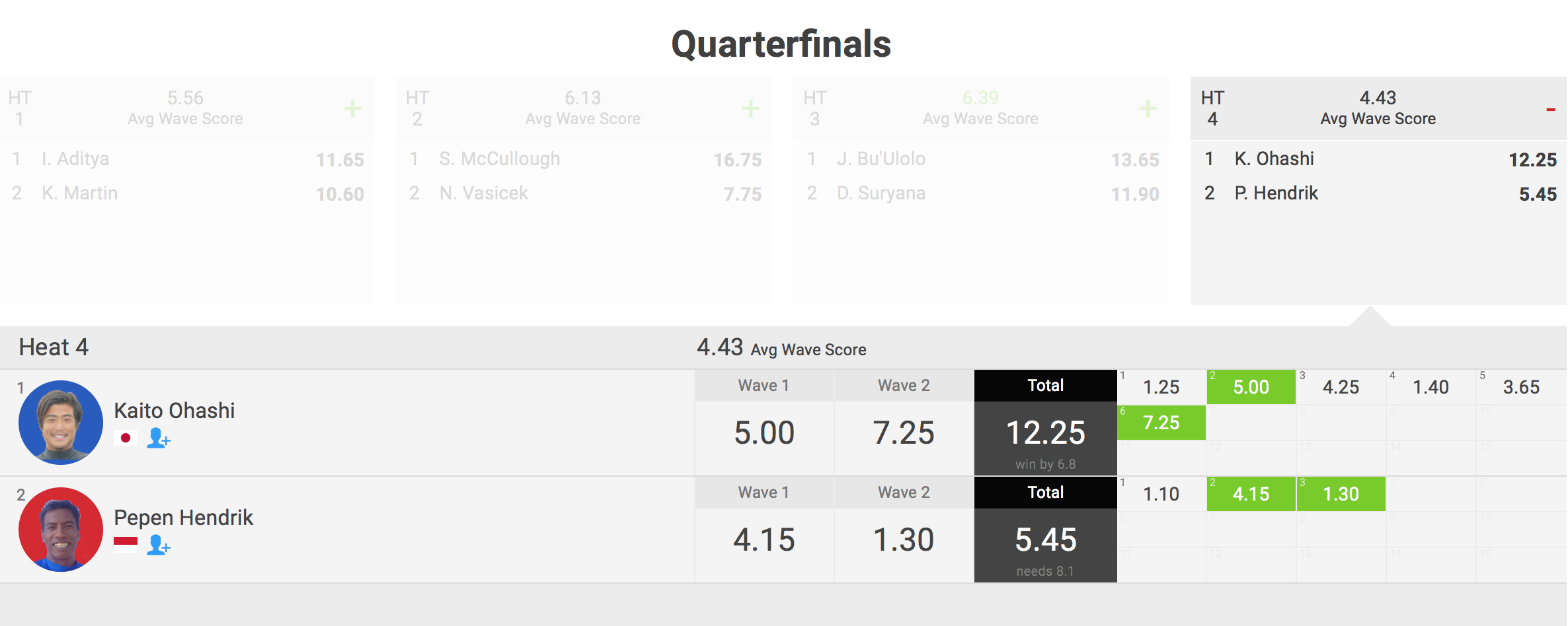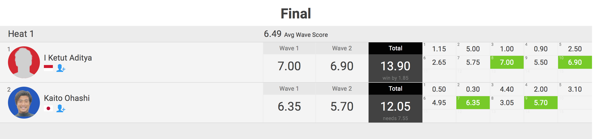 しかし、I Ketut Adityaが8本目の波で7.00pt、10本目の波で6.90ptをマークすると逆転返しを食らう形となり、それでも逆転を狙う大橋が9本目の波で5.70ptとバックアップをまとめるが逆転にはあと一歩及ばず。