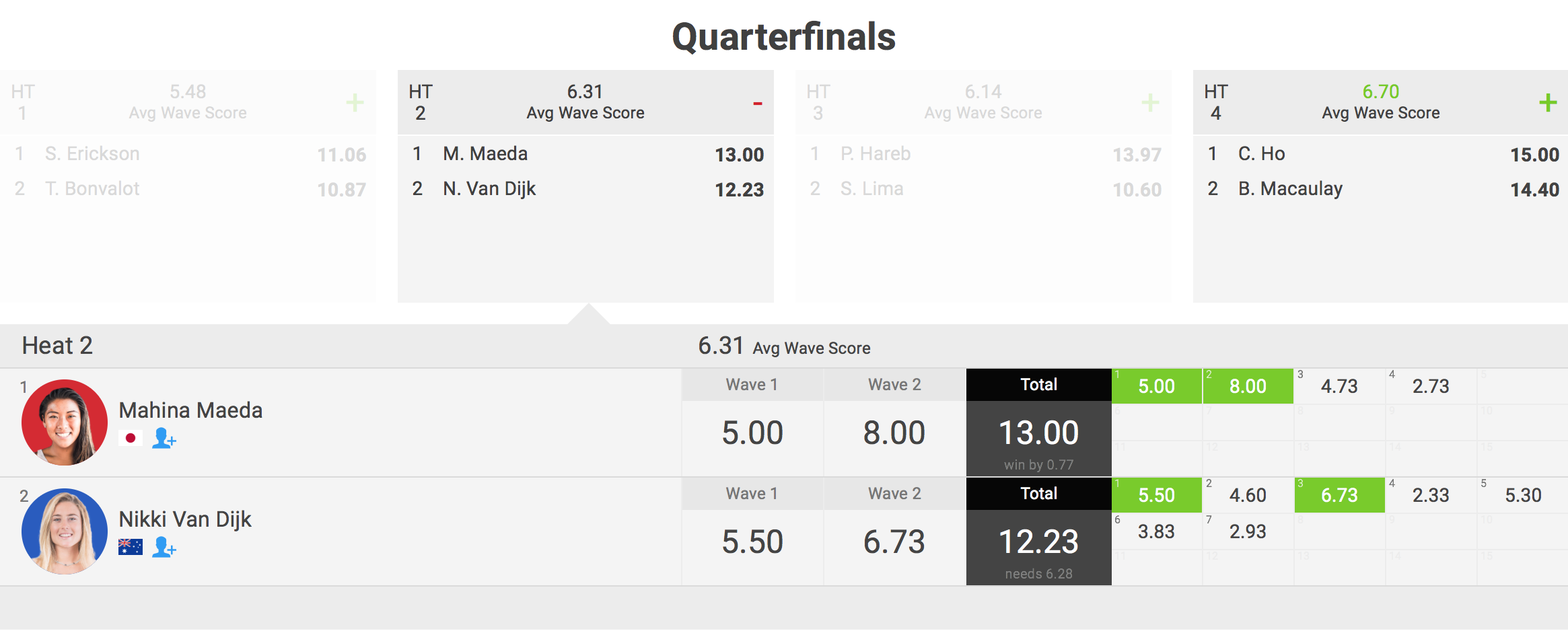 クォーターファイナルのヒート2ではCTサーファーのNikki Van Dujikを倒し、勢いを得たかにみえたが、迎えたセミファイナルのヒート1では惜しくも現役CTサーファーのSage Ericksonに敗退。