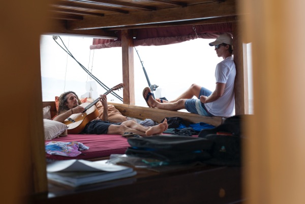 旅の合間のリラックスタイム。音楽はRobにとってサーフィンと同じくらい大切な切っても切れない要素のひとつ。そんなRobが奏でる音が旅を豊かに彩っていく。Rob Machado & Evan Geiselman.