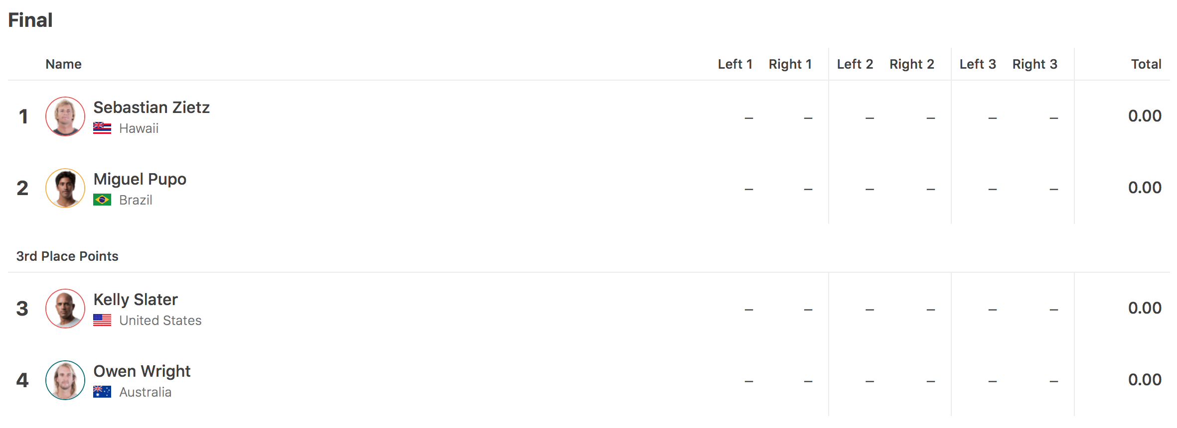 大会最終日となる現地時間の9/9(日)の五十嵐カノアの出番は、RUN1が10:12となるので日本時間の9/10(月)午前2:15、RUN2が12:42となるので日本時間の同日午前4:42、RUN3が2:26となるので日本時間の同日の朝6:15の予定。
