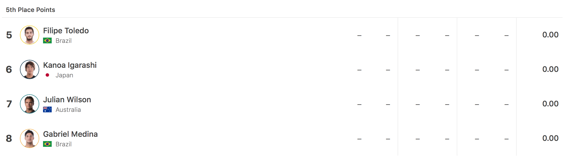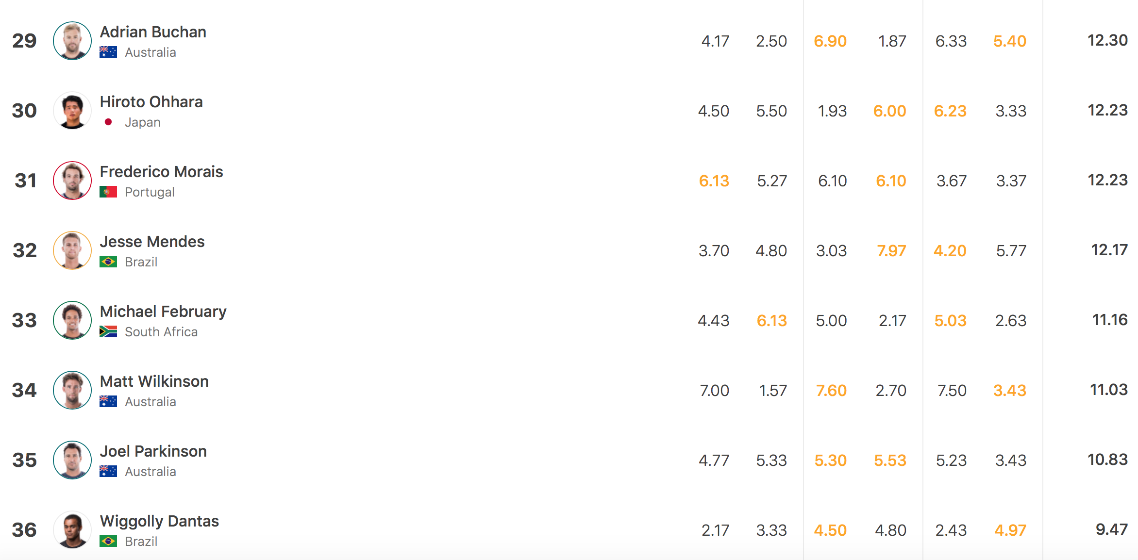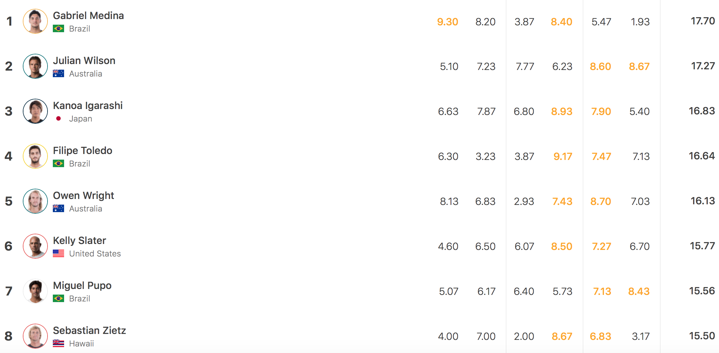 グーフィーの波ではソリッドなリップを連発した後にバックサイド・リバースからのグラブレール・チューブというプログレッシブなコンビネーションを交えたライディングで7.90ptをマークしてバックアップをあげると、一度RUN3でスコアを伸ばしたKelly SlatarやFilipe Toledo、 Owen Wrightたちによって7位となってしまっていたポジションから一気に3位まで浮上!
