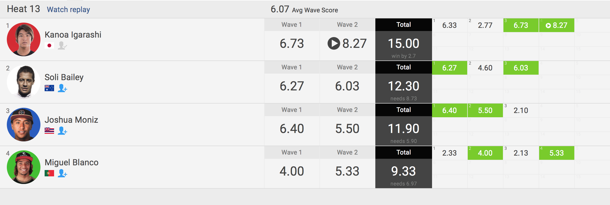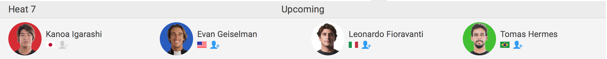 さらに五十嵐カノアはヒート7に組み込まれ、Evan Geiselman、Leonardo Fioravanti、Tomas Hermesと対戦予定となっている。