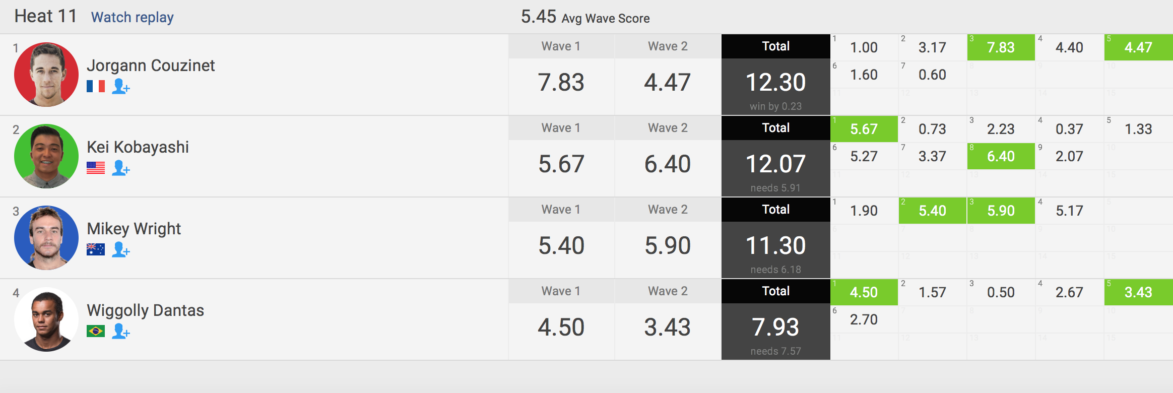 注目の日本人選手の活躍は、ヒート11に出場したカリフォルニア育ちの小林桂がトータルスコア12.07ptをマークし、Mikey WrightとWiggolly Dantasを抑え2位のポジションでラウンド3へ進出!