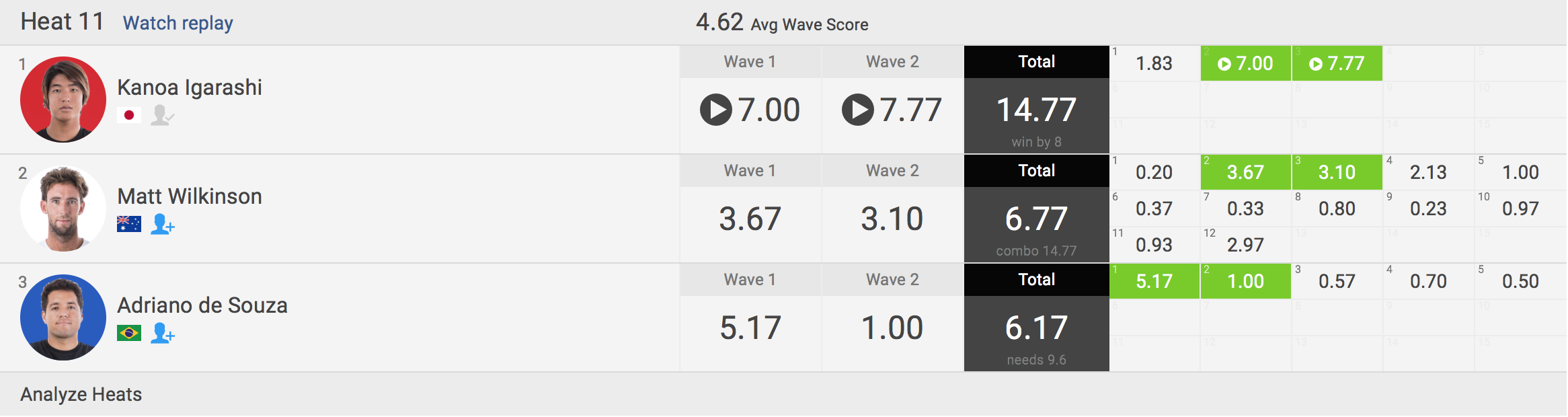 注目の五十嵐カノアはラウンド1のヒート11でMatt Wilkinson、Adriano de Souzaと対戦。