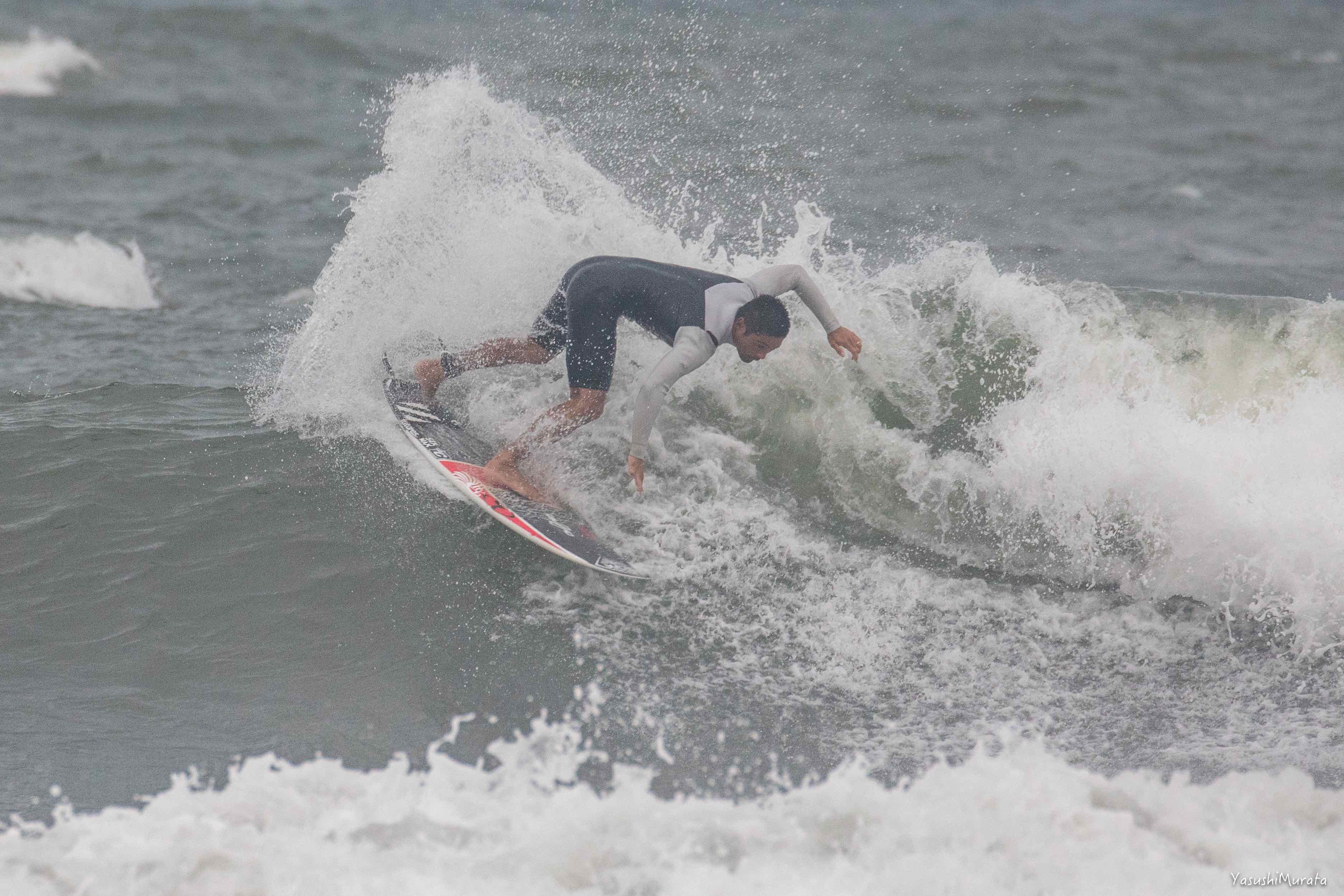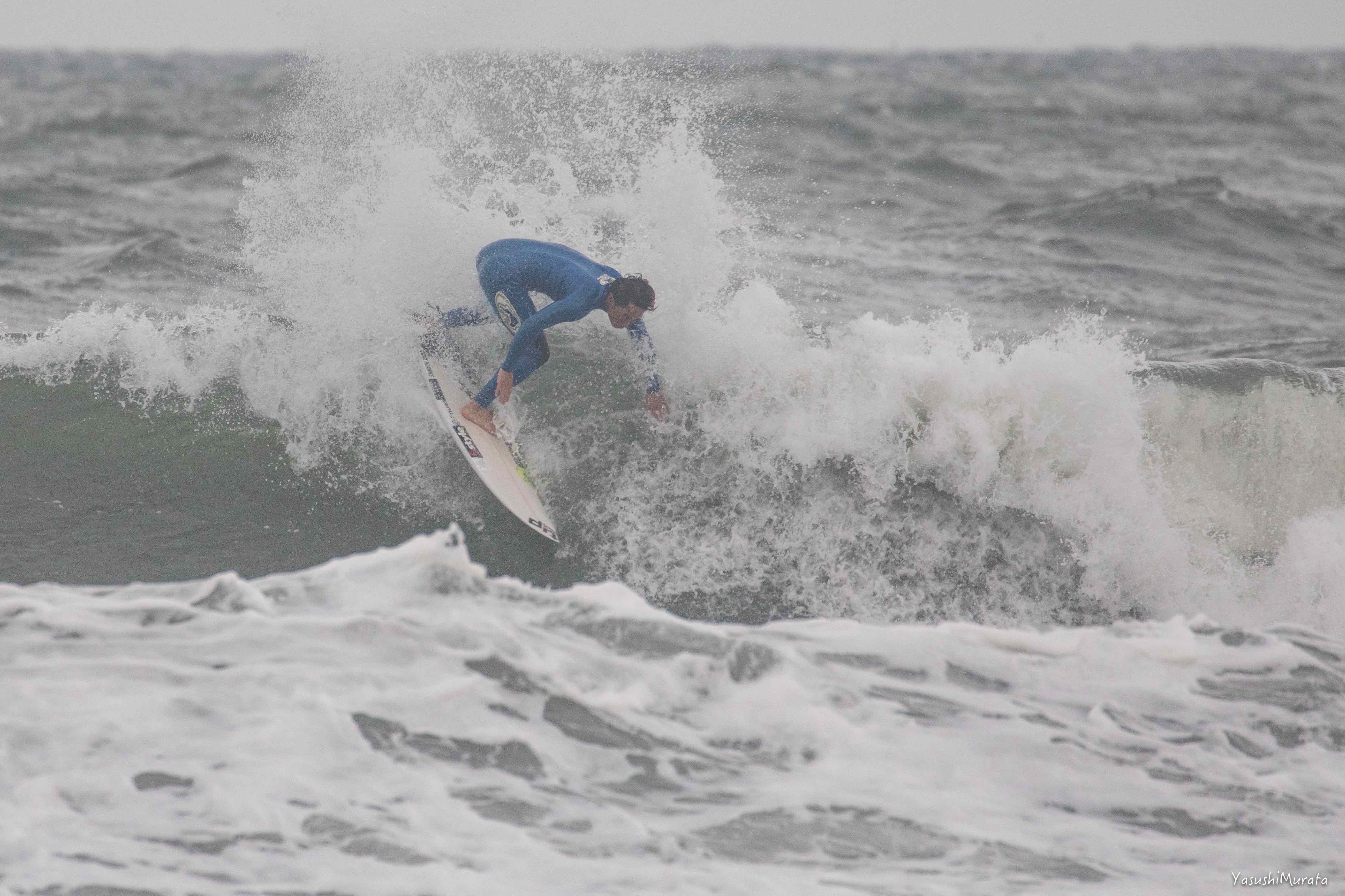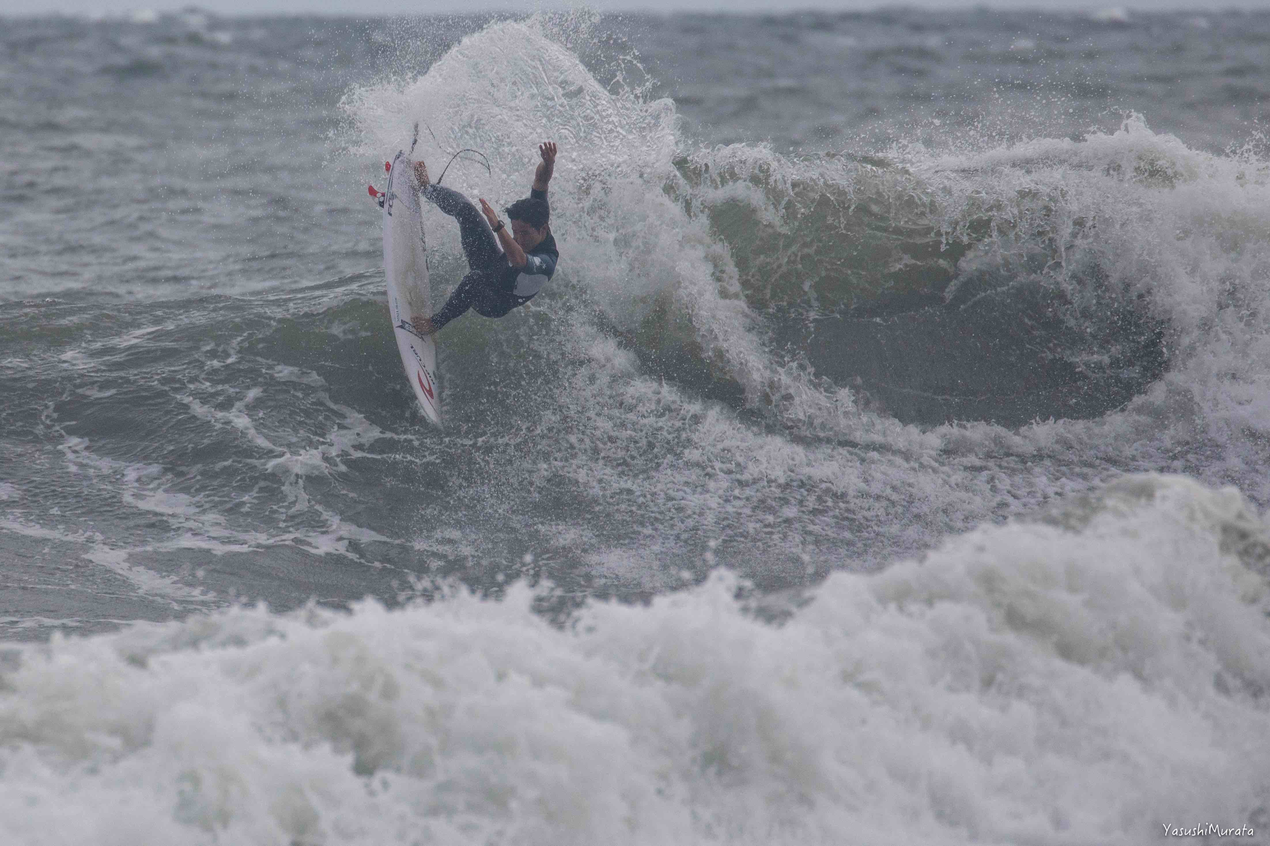 トロいと思ったら急激に掘れ上がったり、オンショア混じりで予想外に変化する乗りづらいコンディションの中、プロでもほとんどがワイプアウトしてしまいそうなインサイドセクションをビッグフローターで駆け抜け、例え紙一重の波でもエクセレント・ウェイブに仕上げてしまう大原洋人。Hiroto Ohhara.