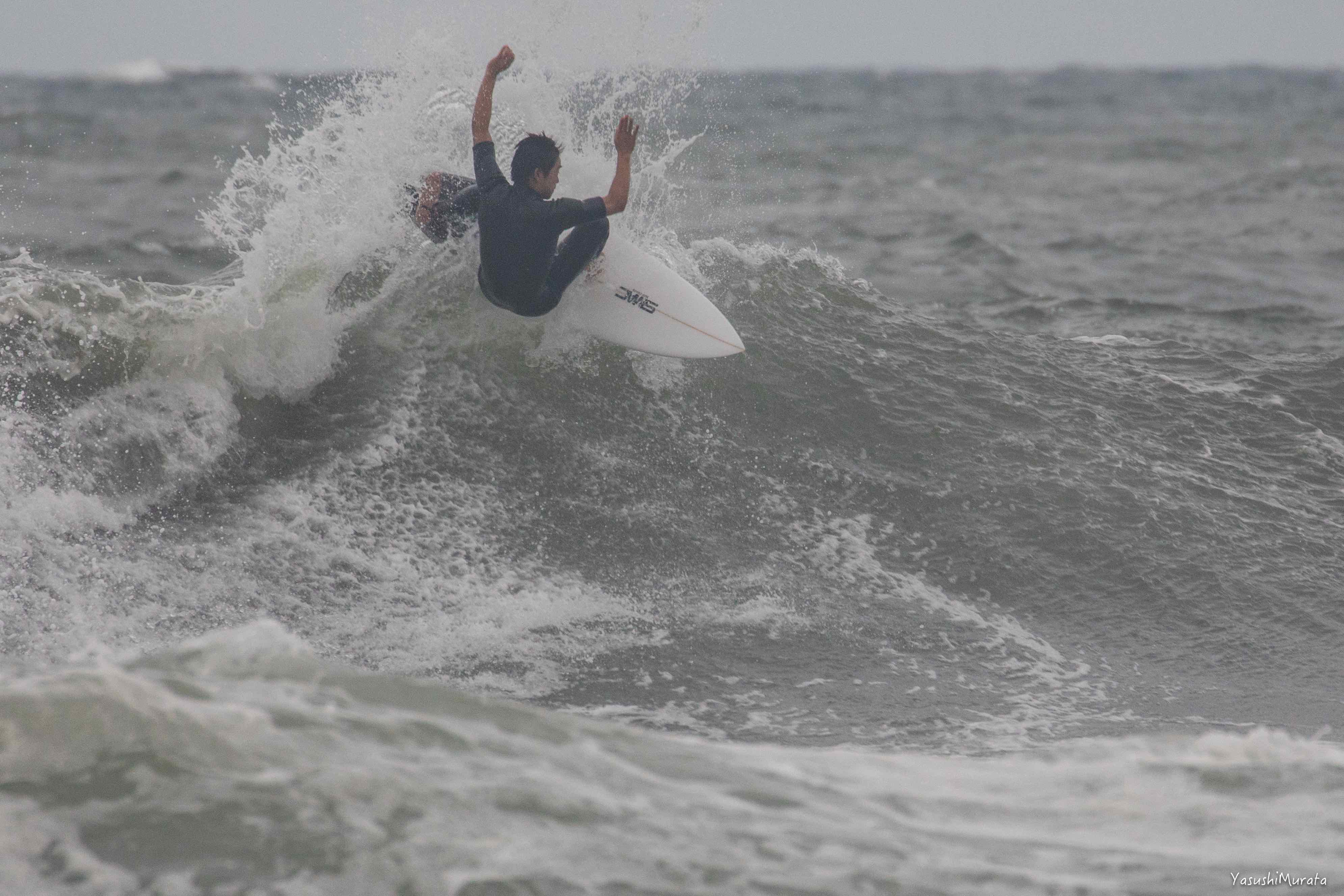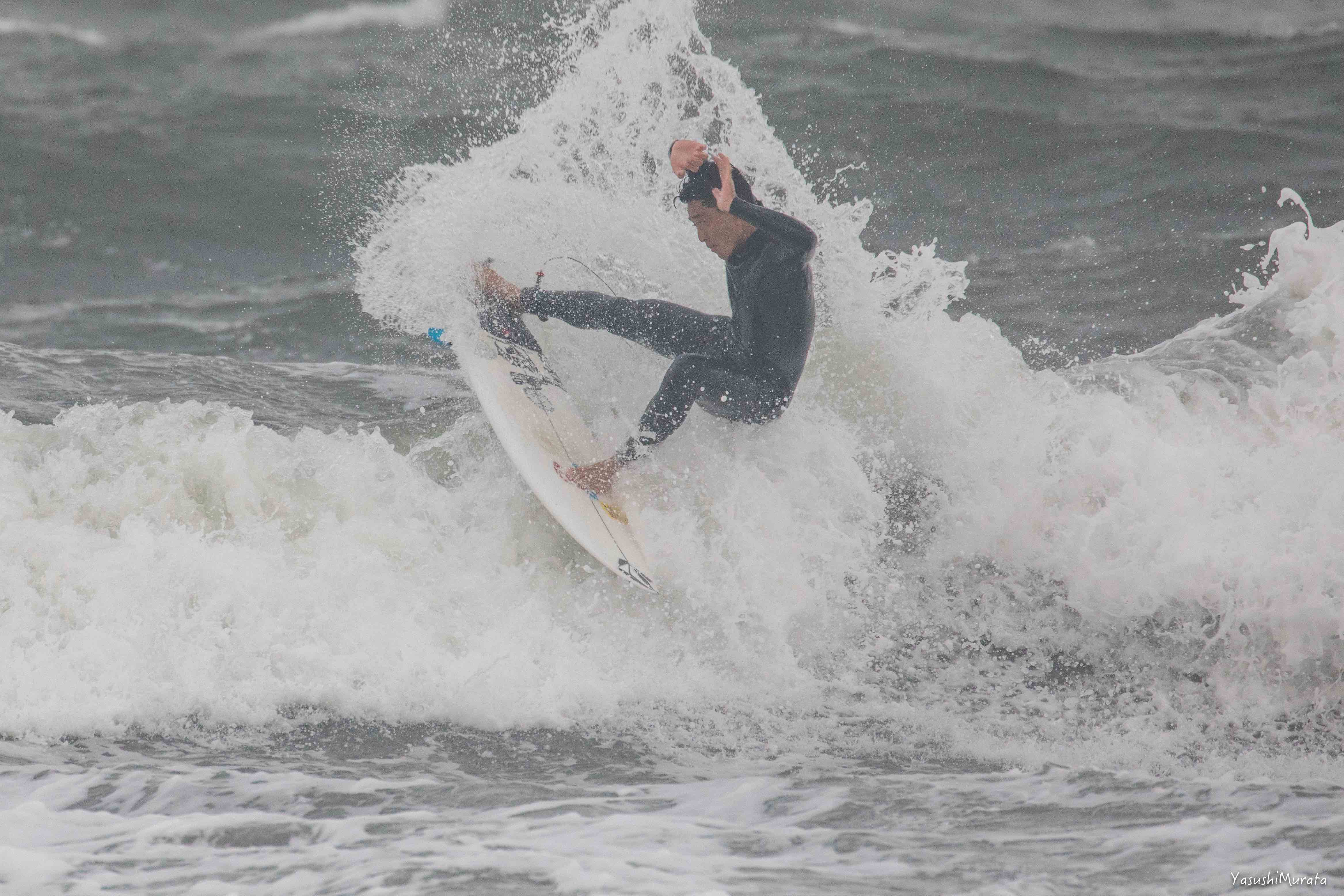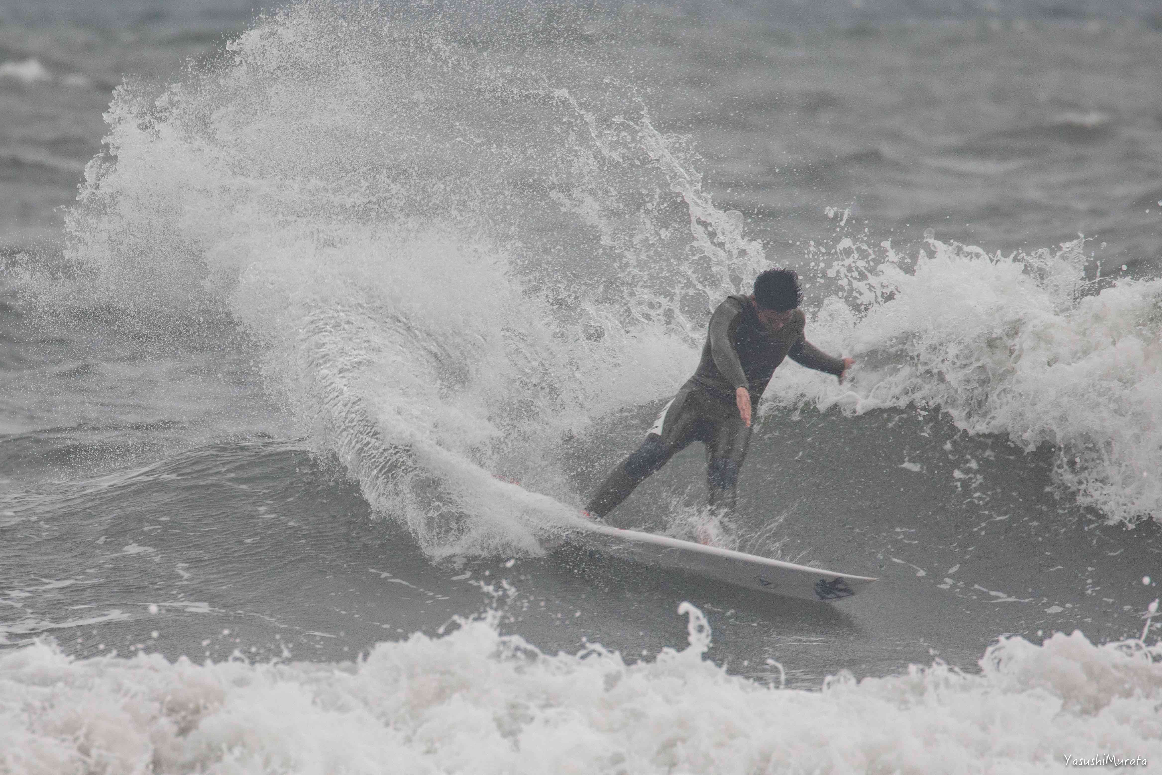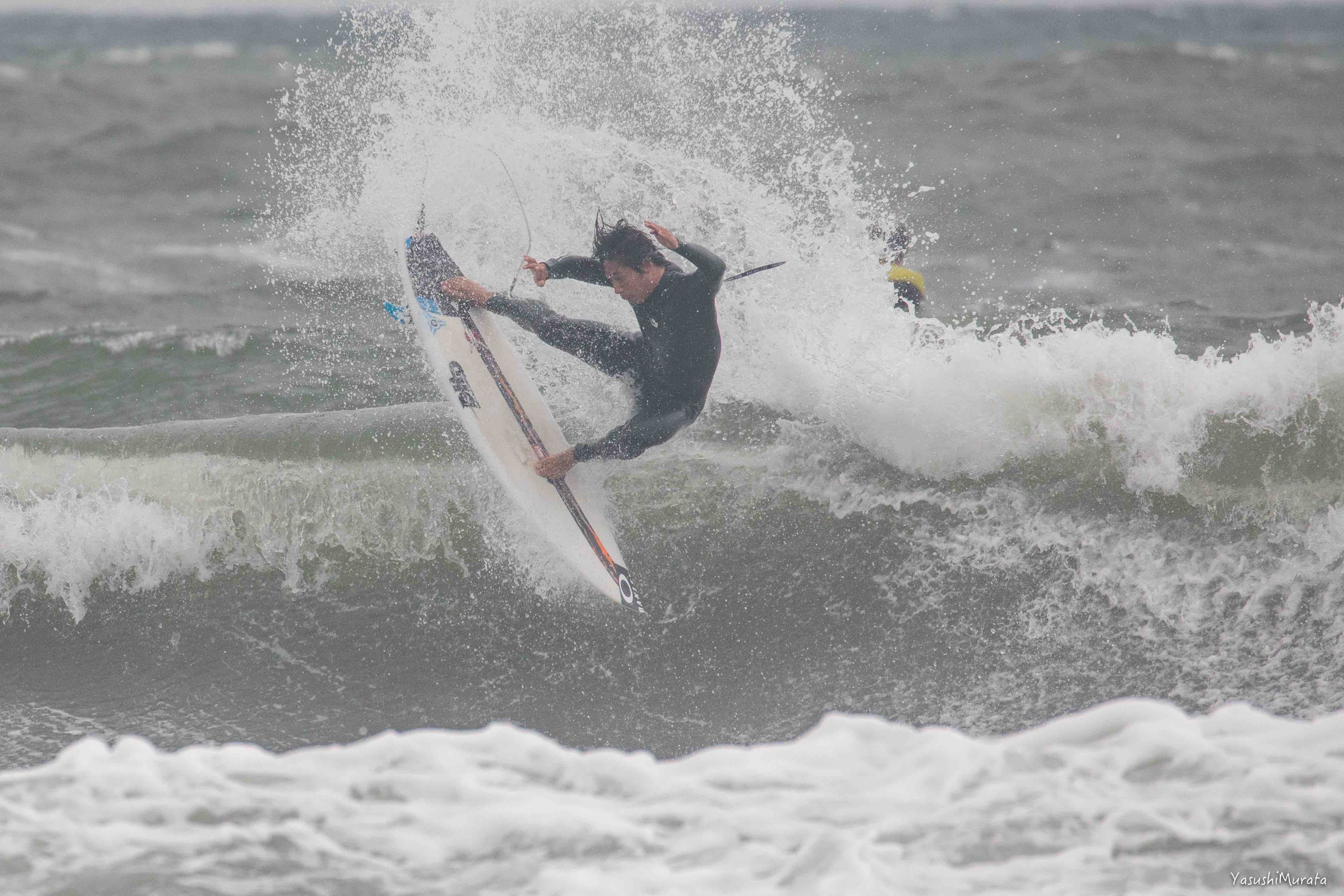 トロいと思ったら急激に掘れ上がったり、オンショア混じりで予想外に変化する乗りづらいコンディションの中、プロでもほとんどがワイプアウトしてしまいそうなインサイドセクションをビッグフローターで駆け抜け、例え紙一重の波でもエクセレント・ウェイブに仕上げてしまう大原洋人。Hiroto Ohhara.