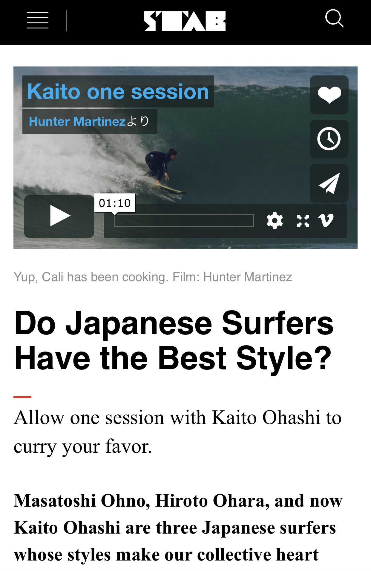 そちらの方はすでにcolorsmagでもお伝えさせて頂いたが、なんと10/18(木)本日は、あの世界一のサーフ系ウェブマガジンとして知られるSTAB magazineにも大野修聖や大原洋人の名前を本文中で挙げつつ、”Do japanese surfers have the best style?(日本人サーファーのベストスタイルは?)”というタイトルでその映像が取り上げられるなど、すでにその知名度と活躍はワールドワイドな日本指折りの世界的トッププロサーファーのひとりだと言って過言ではないだろう。