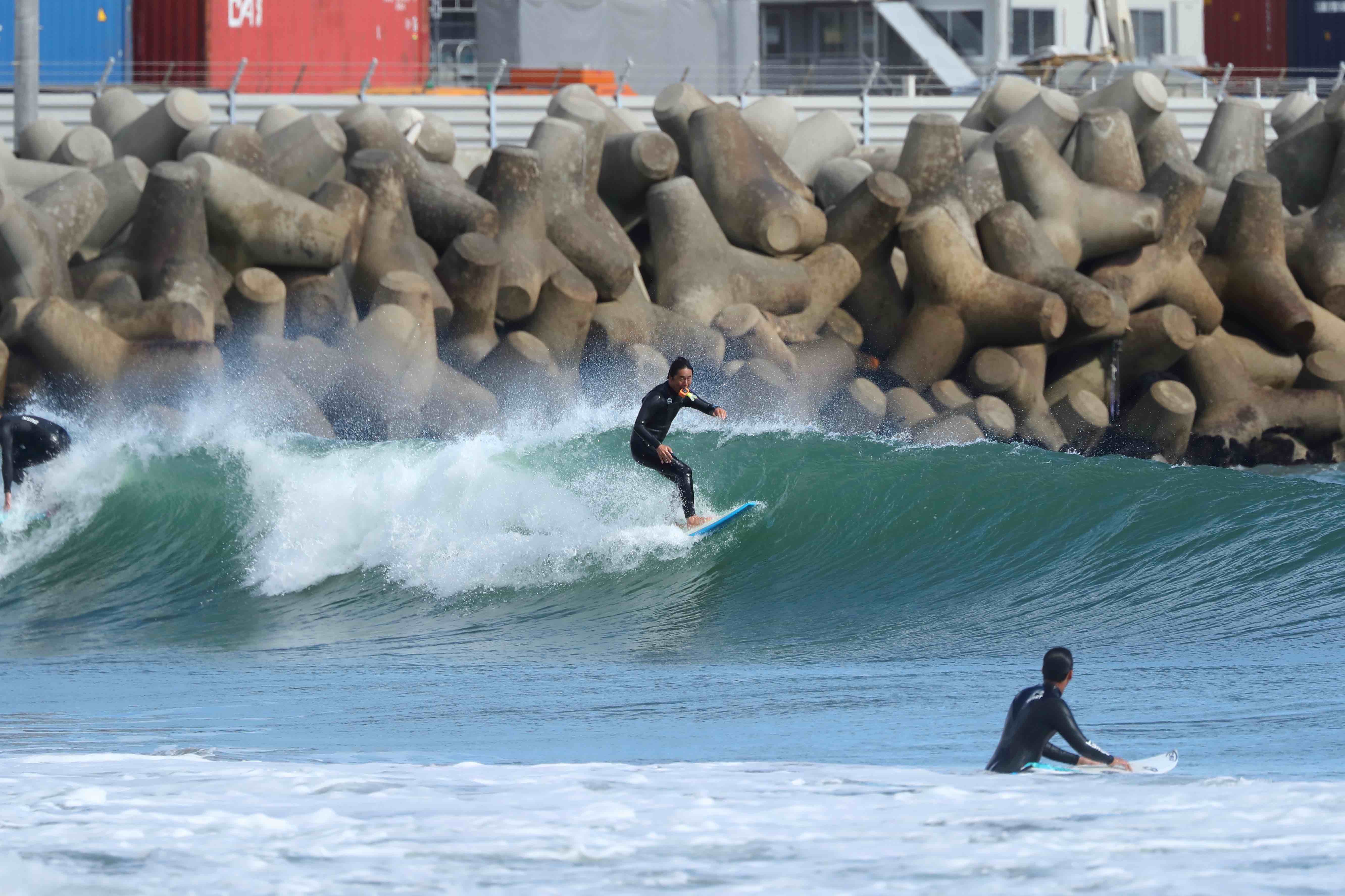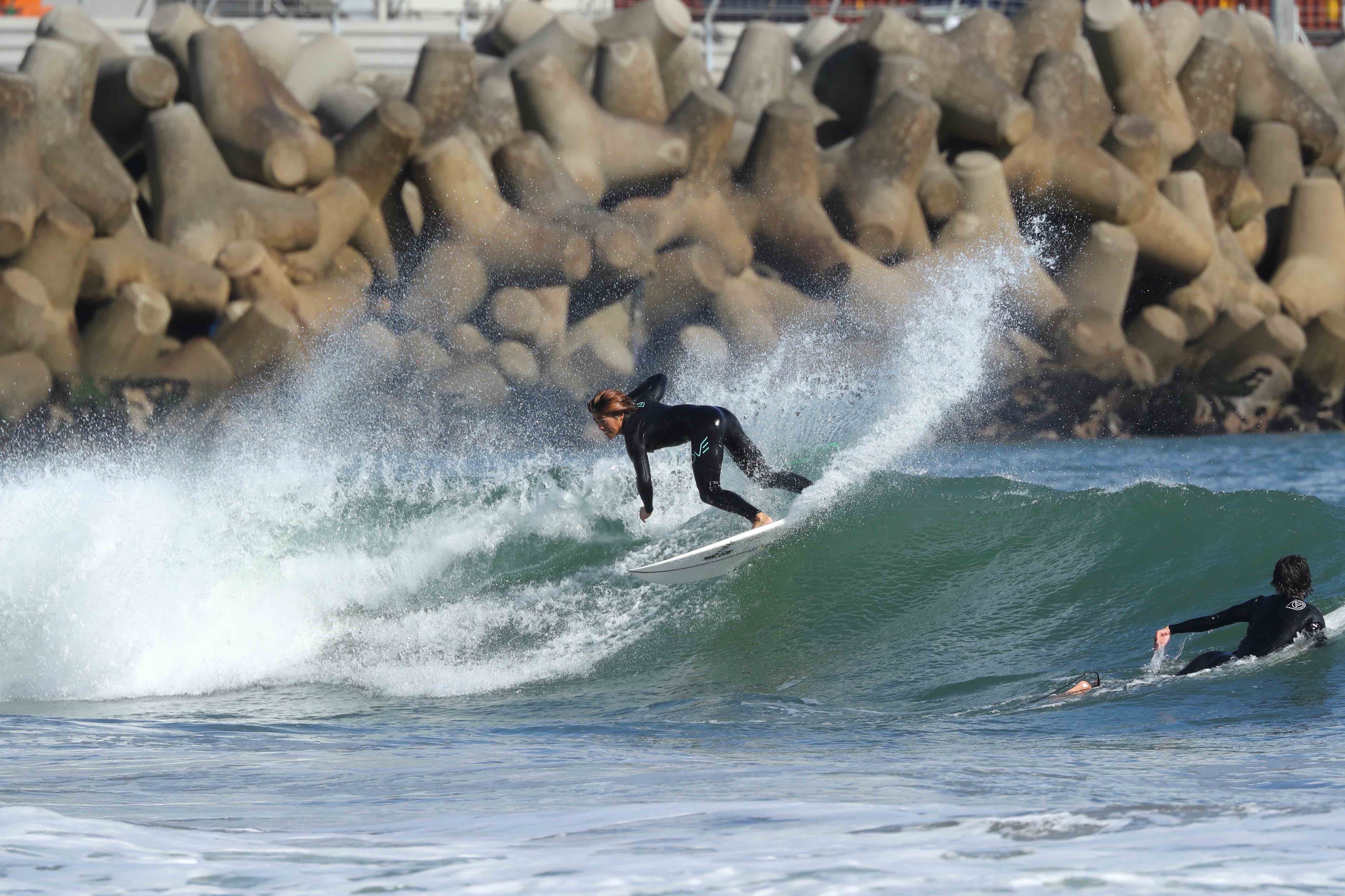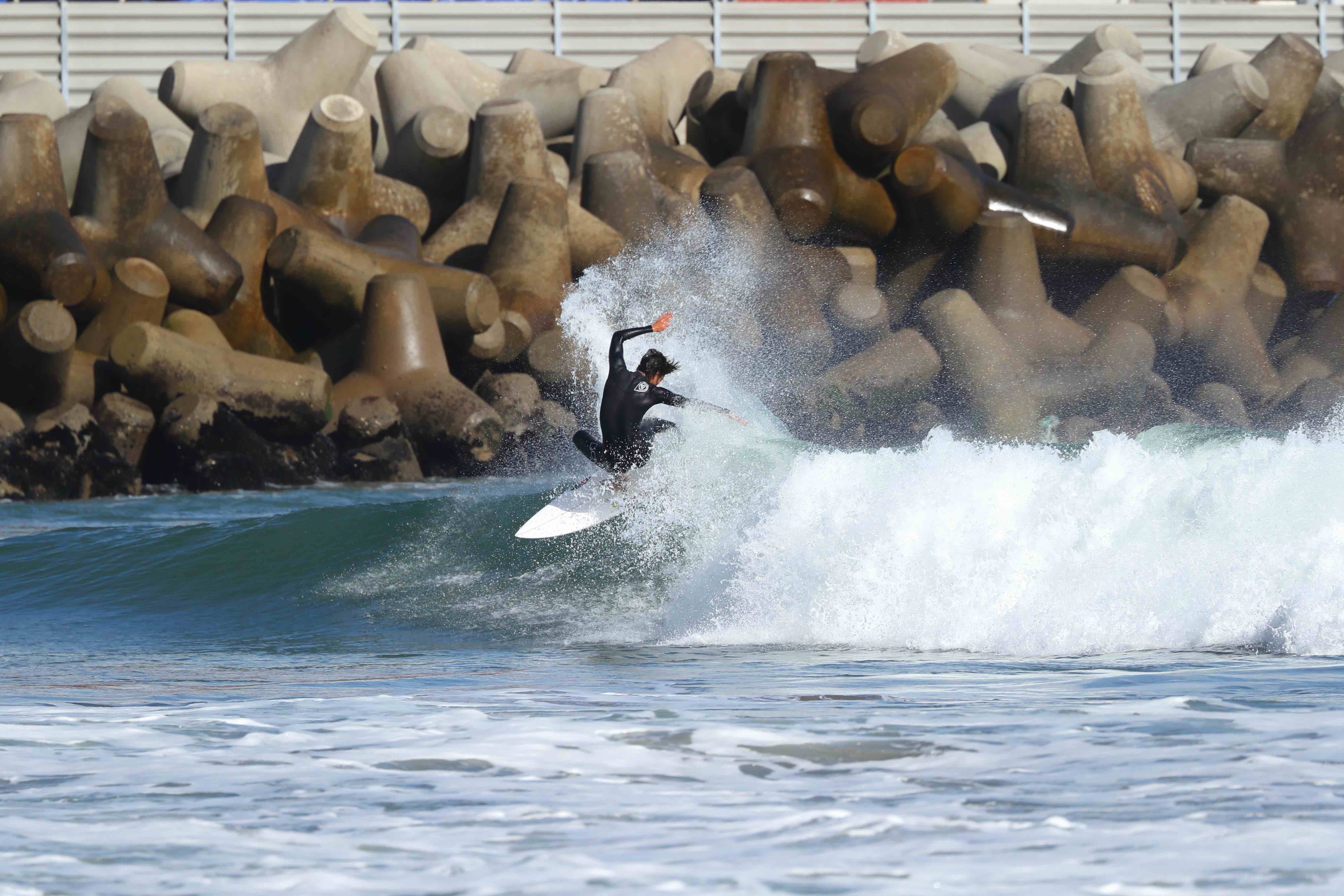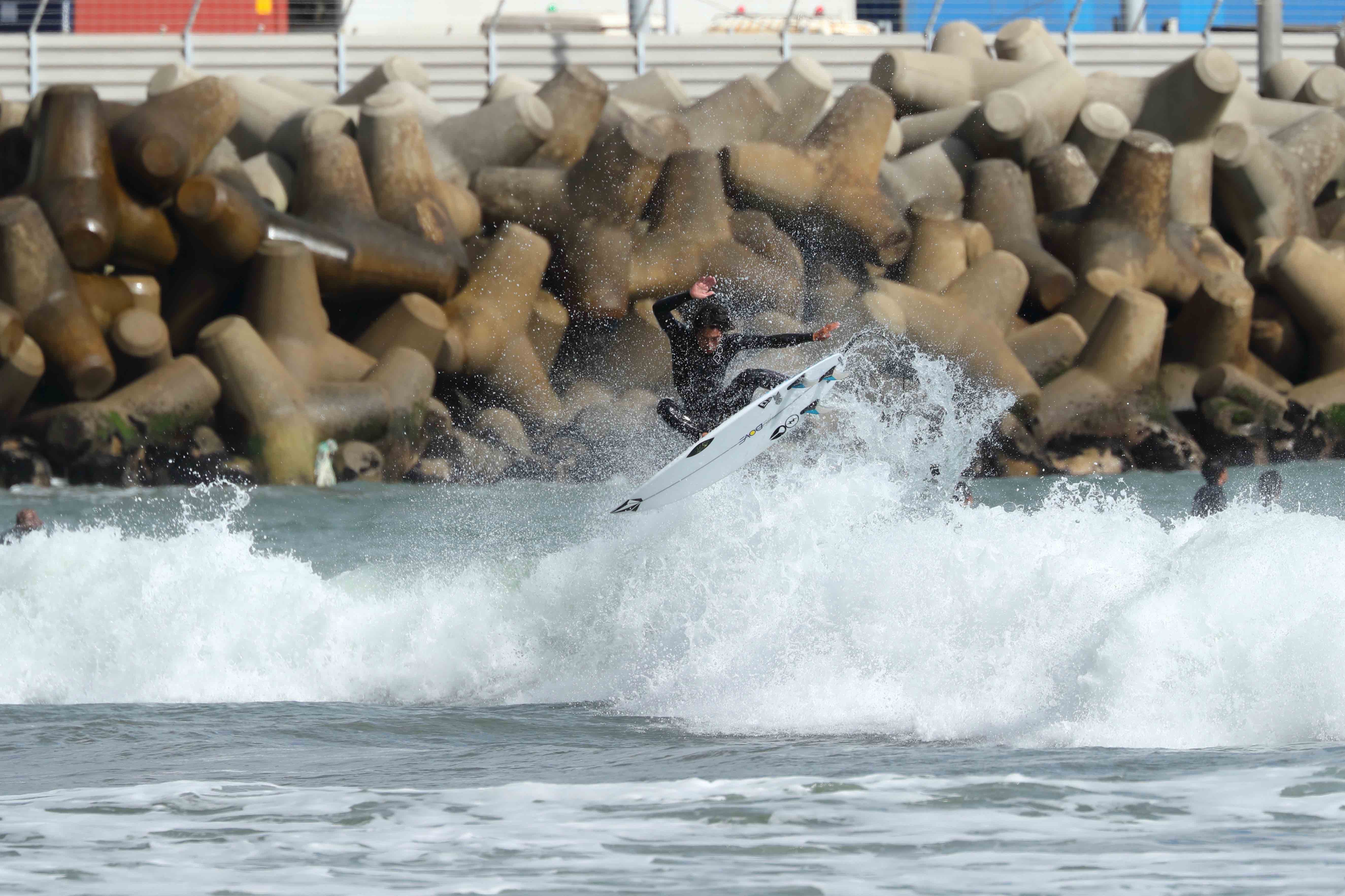 そんな最中、トップシード選手であることからこの日はまだまだ出番のなかった松岡慧斗、小嶋海生、村上舜に加え、その弟の村上蓮、さらには仙台新港を代表するプロサーファーのひとりである越後将平に生粋の新港ローカルボーイでトップアマの熊谷航といったメンバーが、仙台新港のローカルたちが大切にしている堤防際の通称”根っこ”と呼ばれるピークでフリーセッションを決行!!