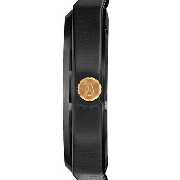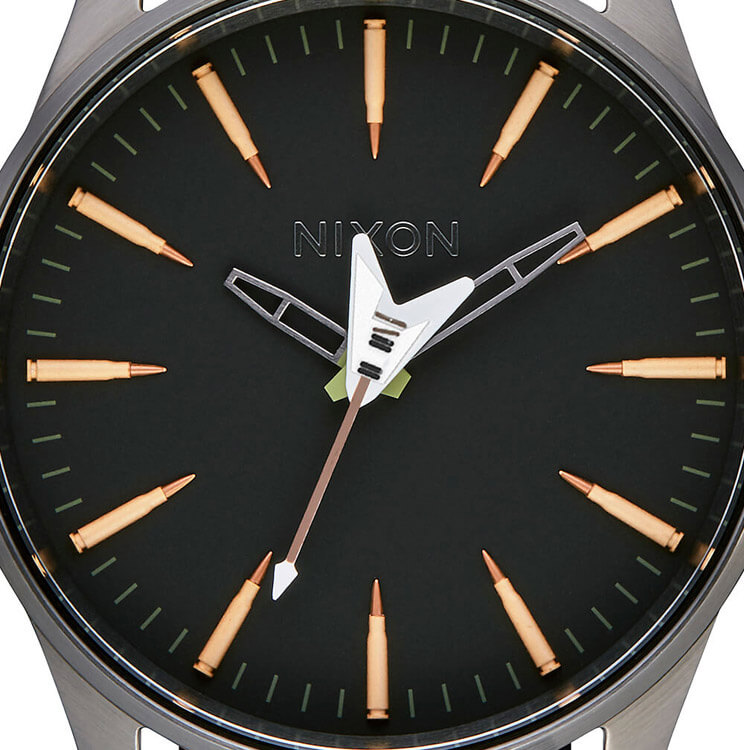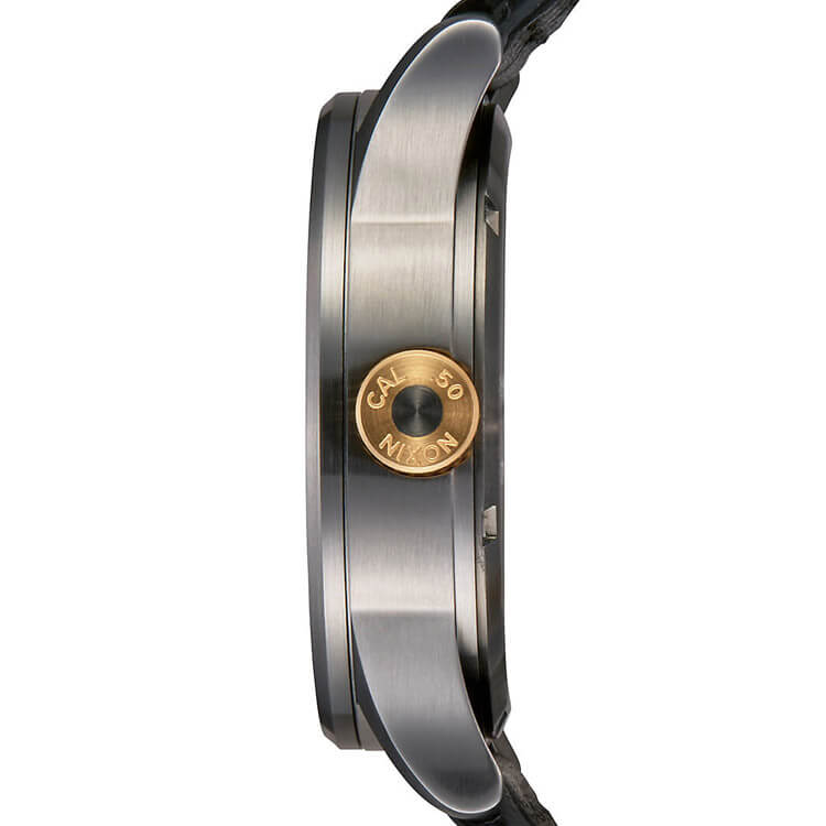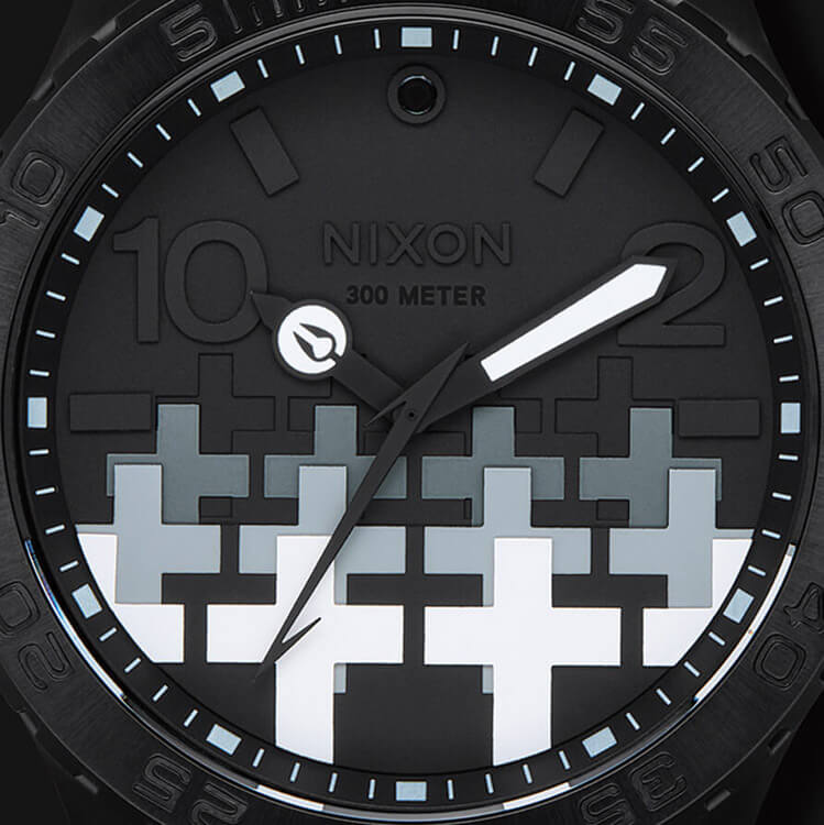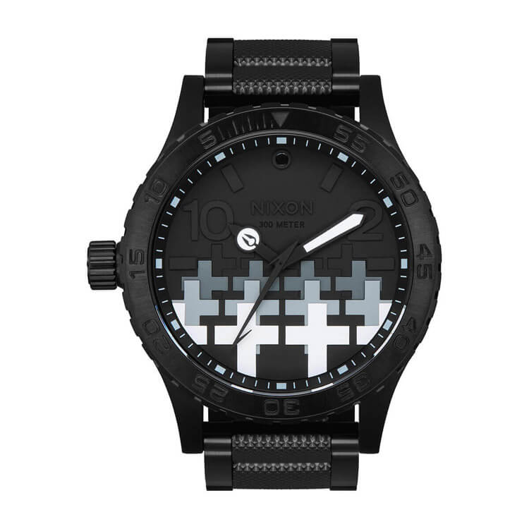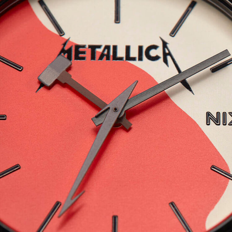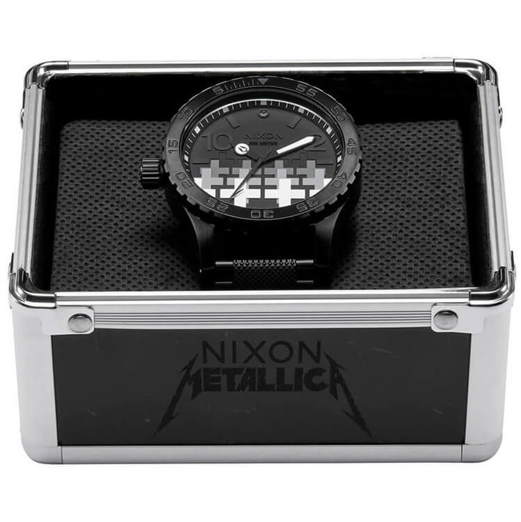 NIXONの代表的なモデルと超人気作”Master of Puppets”を掛け合わせた夢のコラボレーション・モデル。凹凸を活かし、文字盤に立体的な十字架を表現。さらにリューズにも十字架のデザインが、秒針にはバンドロゴがさりげなく施されている。本コラボ・コレクションの中で唯一、ベルト中央部分がエンボス加工デザインとなっているのが特徴。付属BOXは機材ケースを想起させるデザインとなっており、まさにメタル・マスターを手元で感じることができるモデルとなっている。裏蓋には”Master of Puppets”とMETALLICAロゴの刻印入り。¥64,000(税別)