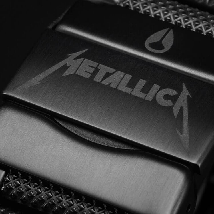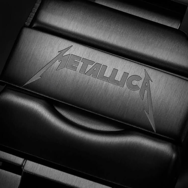 ワールドワイドな知名度を持つイラストレーター、記載パスヘッドのアートワークが施されたモデル。トルクスクリュー型のインデックスを採用し、釘打ちバッドのアートワークにちなんだ釘型をした時針と分針、バンドロゴから流用した秒針も見逃せない。カスタム裏蓋デザインにパスヘッドのシグネチャーとMETALLICAのロゴ刻印入り。¥17,000(税別)