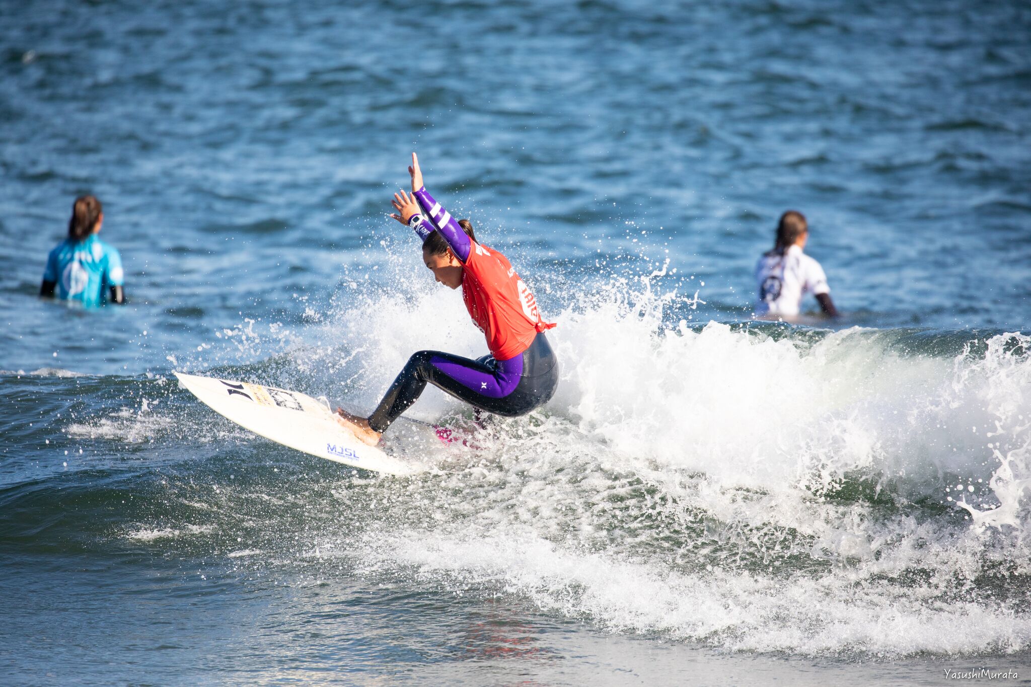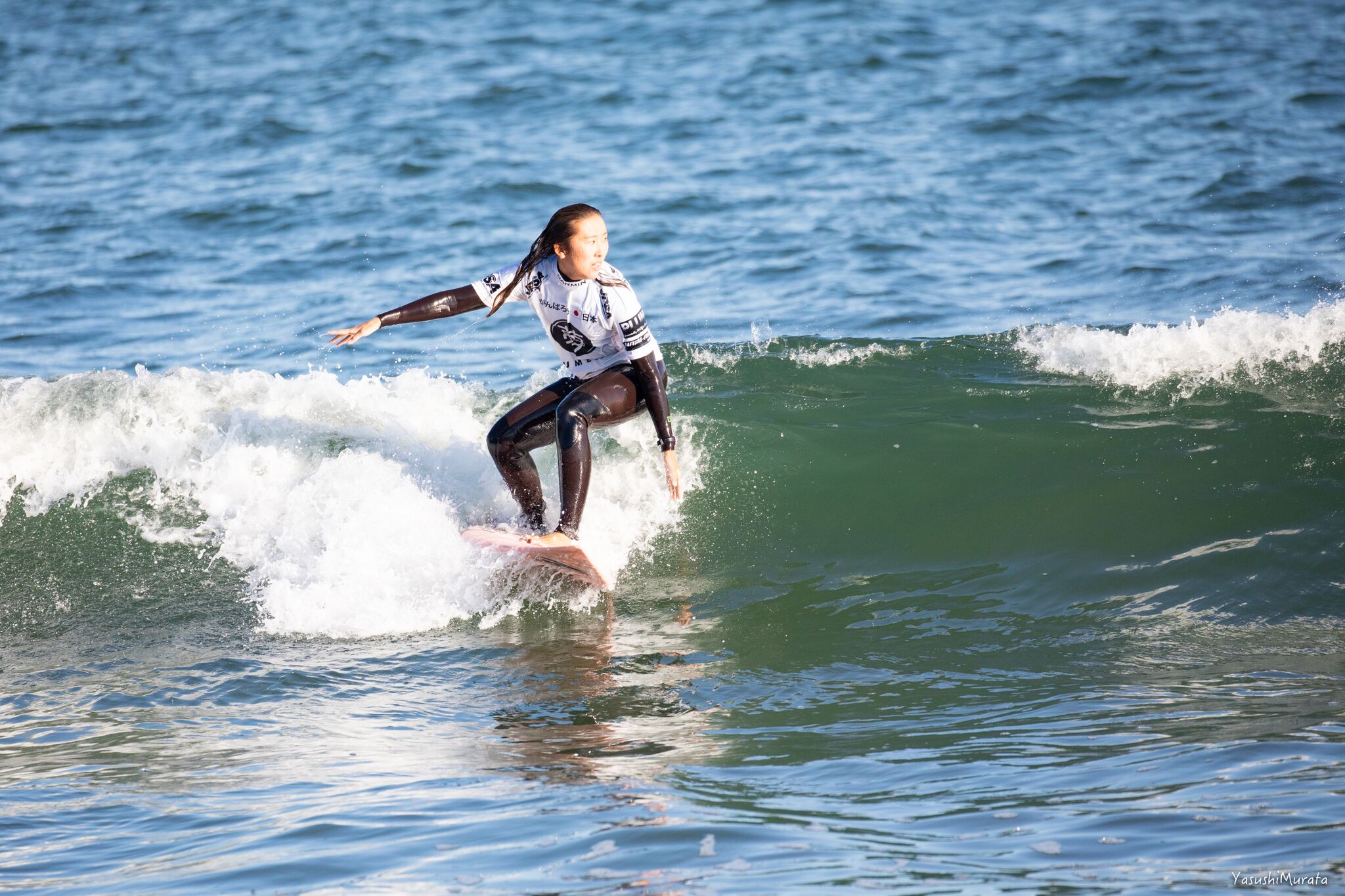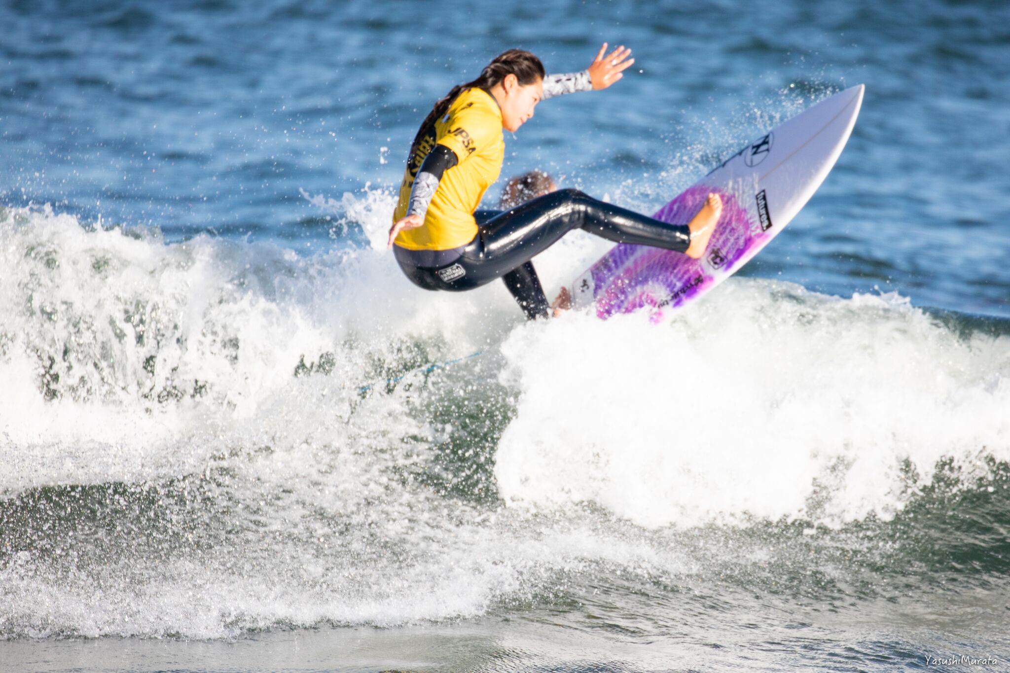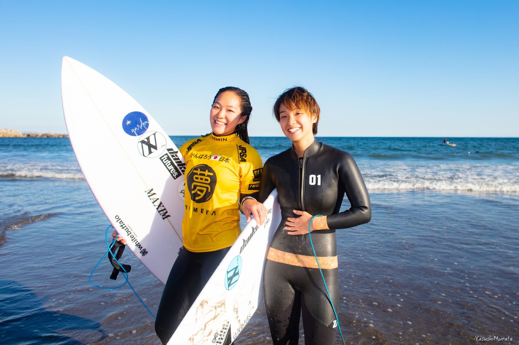 アマチュアサーファーとして参戦した”田原オープン”のWOMENSにおいて準優勝を遂げ、文句なしのプロ資格まで獲得した茅ヶ崎出身の馬庭彩。そんな馬庭彩と同様、アマチュアサーファーとして参戦した”田原オープン”においてファイナル進出を果たし、見事3位入賞を果たした松永莉奈。現代のサーフシーンにおける十代のgirlsサーファーたちのレベルの高さは未だかつてない領域に達していることを再確認せざるを得ない”田原オープン”WOMENSファイナルとなった。Above : Sai Maniwa. Below : Rina Matsunaga.